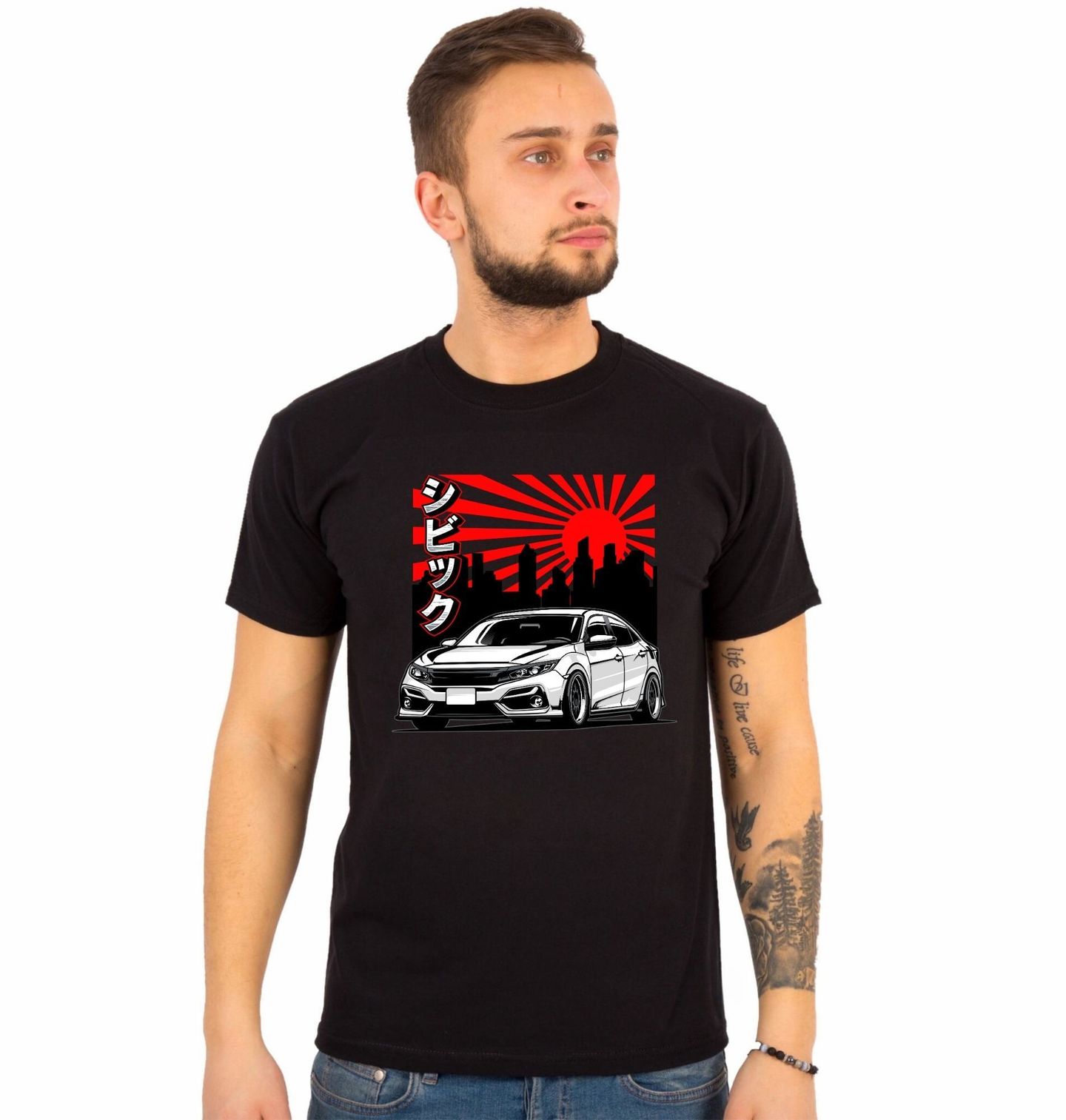 Pánské tričko Honda Civic Tokyo Street Car. Moderní design zachycuje sportovně upravené japonské auto inspirované ikonickou linií Honda Civic a dynamikou městských ulic. Červené vycházející slunce a japonské znaky vytvářejí výraznou atmosféru, která okamžitě evokuje Japonsko a jeho jedinečnou automobilovou kulturu.