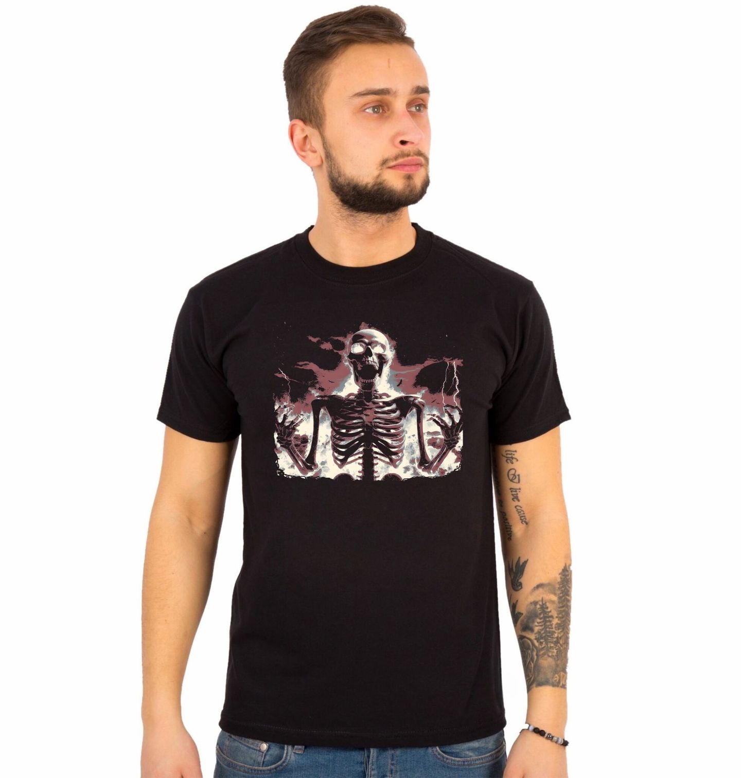 Pánské tričko Hořící Kostlivec. Kostlivec povstal z ohně nebo popela a zároveň ho sežehly blesky – jeho lebka i celé tělo jakoby září zevnitř, jako kdyby byl nabitý tou bouřlivou energií. Tento motiv je ideální pro fanoušky metalu, hororu, fantasy i temného umění.