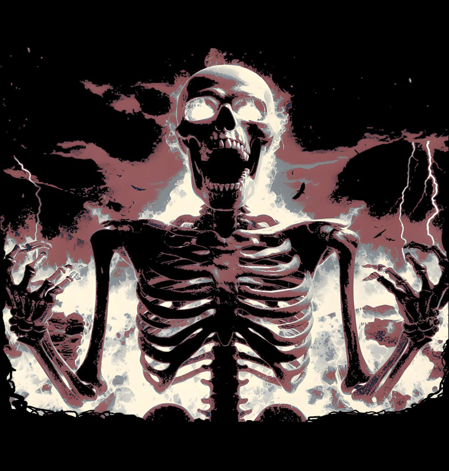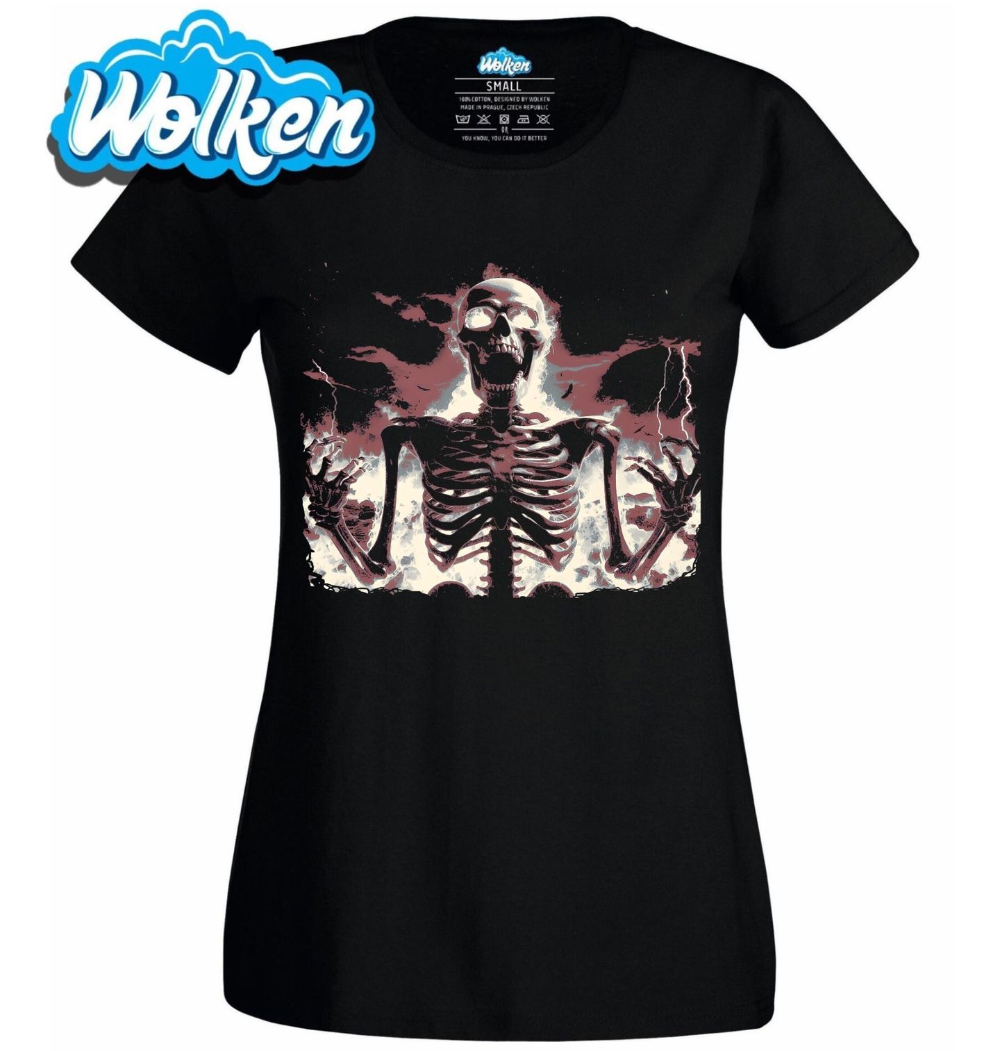 Dámské tričko Hořící Kostlivec. Kostlivec povstal z ohně nebo popela a zároveň ho sežehly blesky – jeho lebka i celé tělo jakoby září zevnitř, jako kdyby byl nabitý tou bouřlivou energií. Tento motiv je ideální pro fanoušky metalu, hororu, fantasy i temného umění.