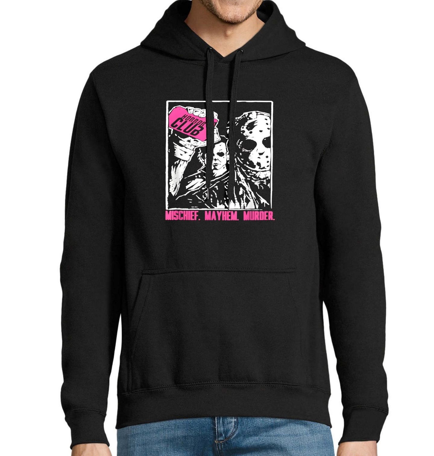 Pánská mikina Hororový Klub Rváčů. Horror Club Jason Voorhees a Michael Myers. Mischief. Mayhem. Murder. Vítejte do klubu, kde se nebojuje pěstmi, ale noži a mačetami! Stylové triko s motivem "Horror Club" je parodií na kultovní film Fight Club, ale místo Brada Pitta tu dostává prostor Jason Voorhees, Michael Myers a další ikony hororu. Perfektní pro fanoušky hororů a Halloweenu.