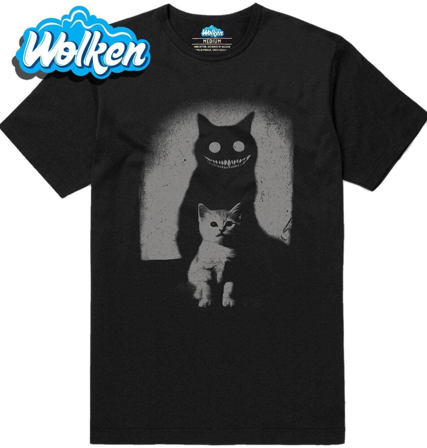 Pánské tričko Hororový Stín Démonické Kočky. Nevinně vypadající kočka s démonickým stínem za zády odhaluje svou temnou stránku v děsivě stylizovaném horor motivu. Kontrast světla a stínu vytváří znepokojivou atmosféru, která osloví fanoušky temné estetiky, gotiky i psychologického hororu.