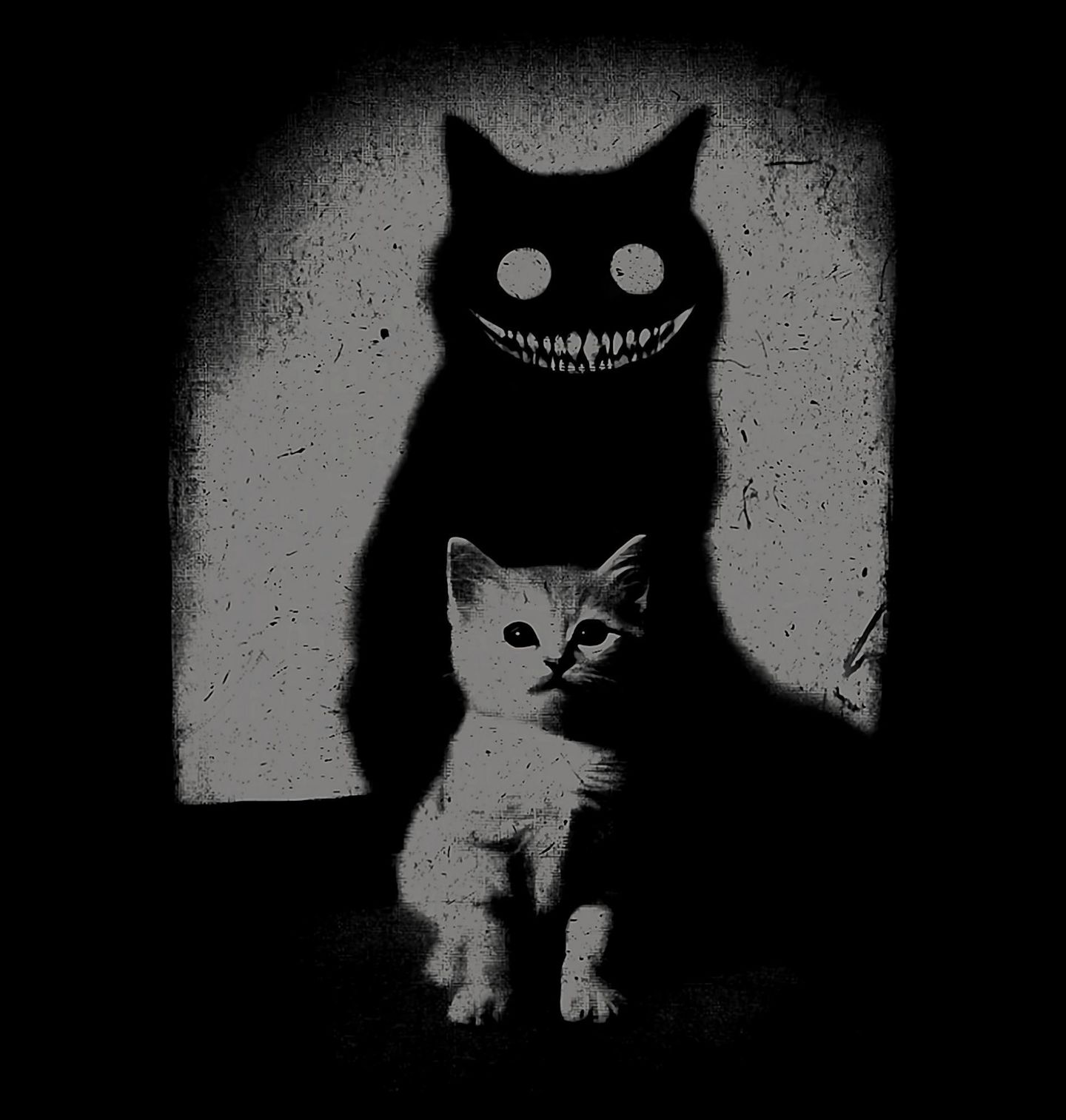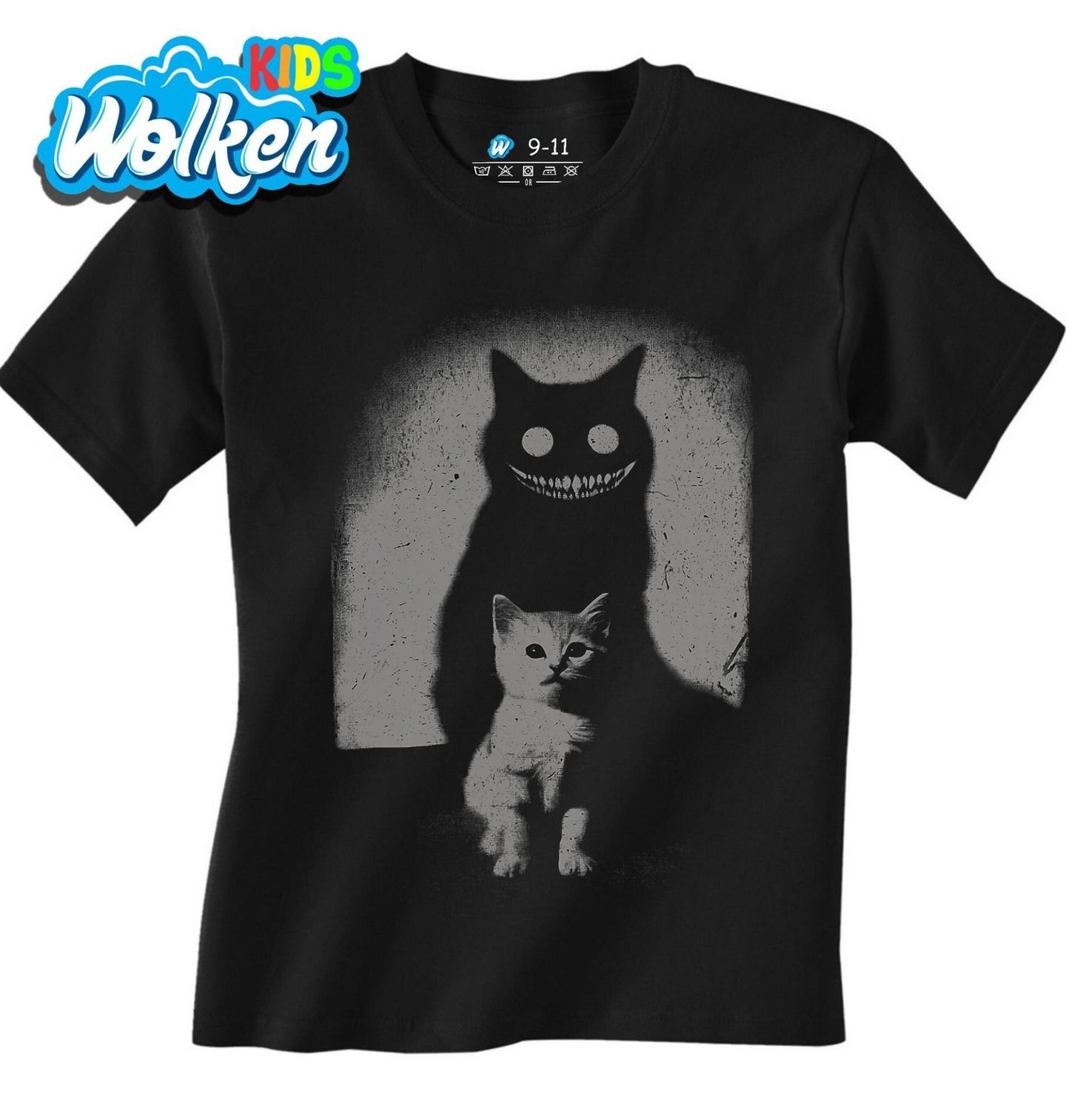 Dětské tričko Hororový Stín Démonické Kočky. Nevinně vypadající kočka s démonickým stínem za zády odhaluje svou temnou stránku v děsivě stylizovaném horor motivu. Kontrast světla a stínu vytváří znepokojivou atmosféru, která osloví fanoušky temné estetiky, gotiky i psychologického hororu.