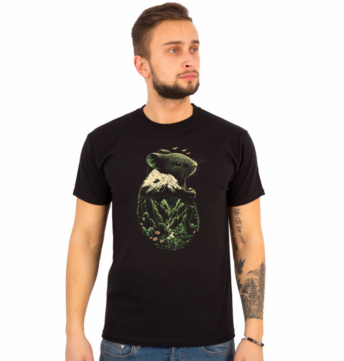 Pánské tričko Horská Myš. Originální motiv, který spojuje zvířecí něhu s majestátní krásou přírody. Myš s krajinou plnou hor a lesa v sobě nese symboliku spojení s přírodou, klidu a svobody. Skvělý design pro milovníky zvířat, turistiky a outdoorové estetiky.