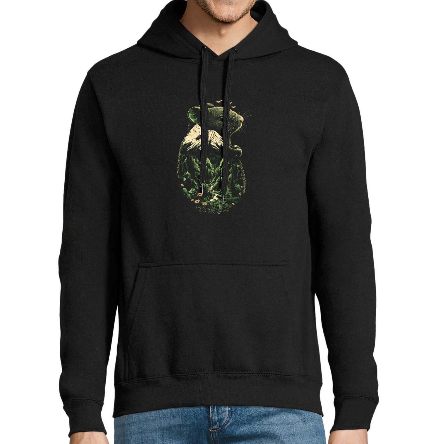 Pánská mikina Horská Myš. Originální motiv, který spojuje zvířecí něhu s majestátní krásou přírody. Myš s krajinou plnou hor a lesa v sobě nese symboliku spojení s přírodou, klidu a svobody. Skvělý design pro milovníky zvířat, turistiky a outdoorové estetiky.