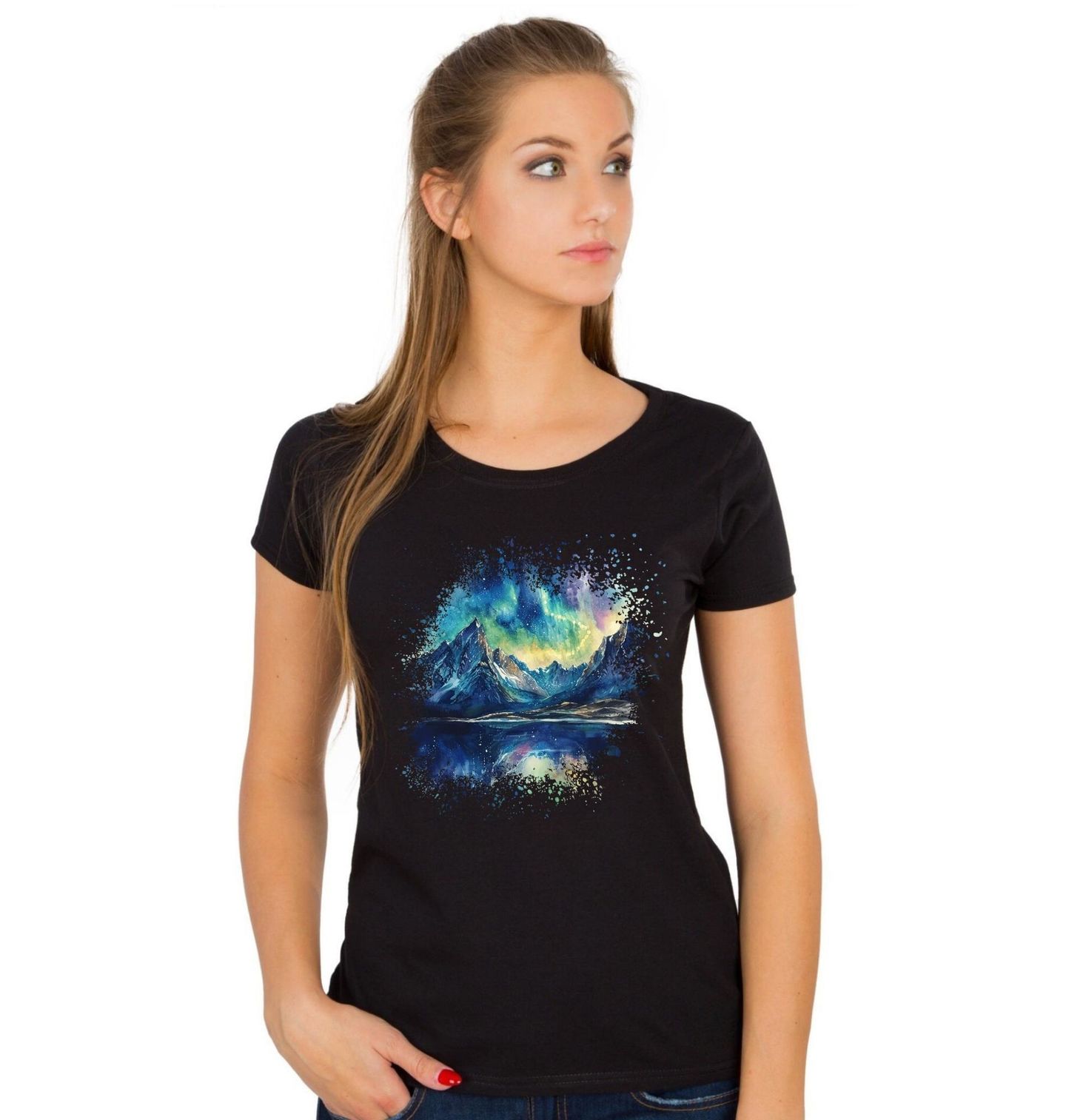 Dámské tričko Horské Jezero pod Polární Září. Tento motiv zachycuje magickou krajinu, kde se hory zrcadlí v klidné hladině jezero a nad nimi se rozprostírá tajemná polární záře. Atmosféra obrazu evokuje vzdálený sever, místo ticha, čistoty a hlubokého spojení s přírodou. Jemné barvy noční oblohy se prolínají s dramatickými horskými vrcholy a vytvářejí harmonickou, snovou scenérii.