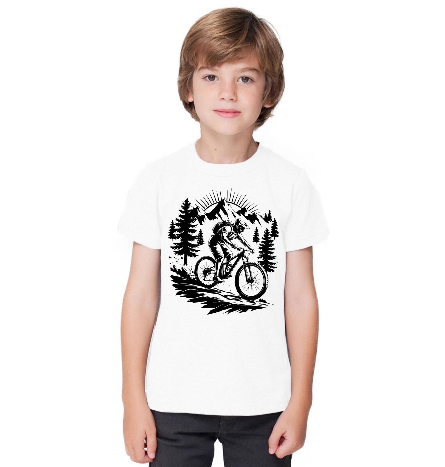 Dětské tričko Horské kolo MTB Rider. Dynamický černobílý motiv cyklisty sjíždějícího horský terén. V pozadí jsou jehličnaté stromy a horské štíty se stylizovanými paprsky slunce. Design vystihuje rychlost, odvahu a dobrodružství spojené s horskou cyklistikou. Tento motiv je vhodný pro milovníky MTB, trailů a adrenalinu v přírodě.