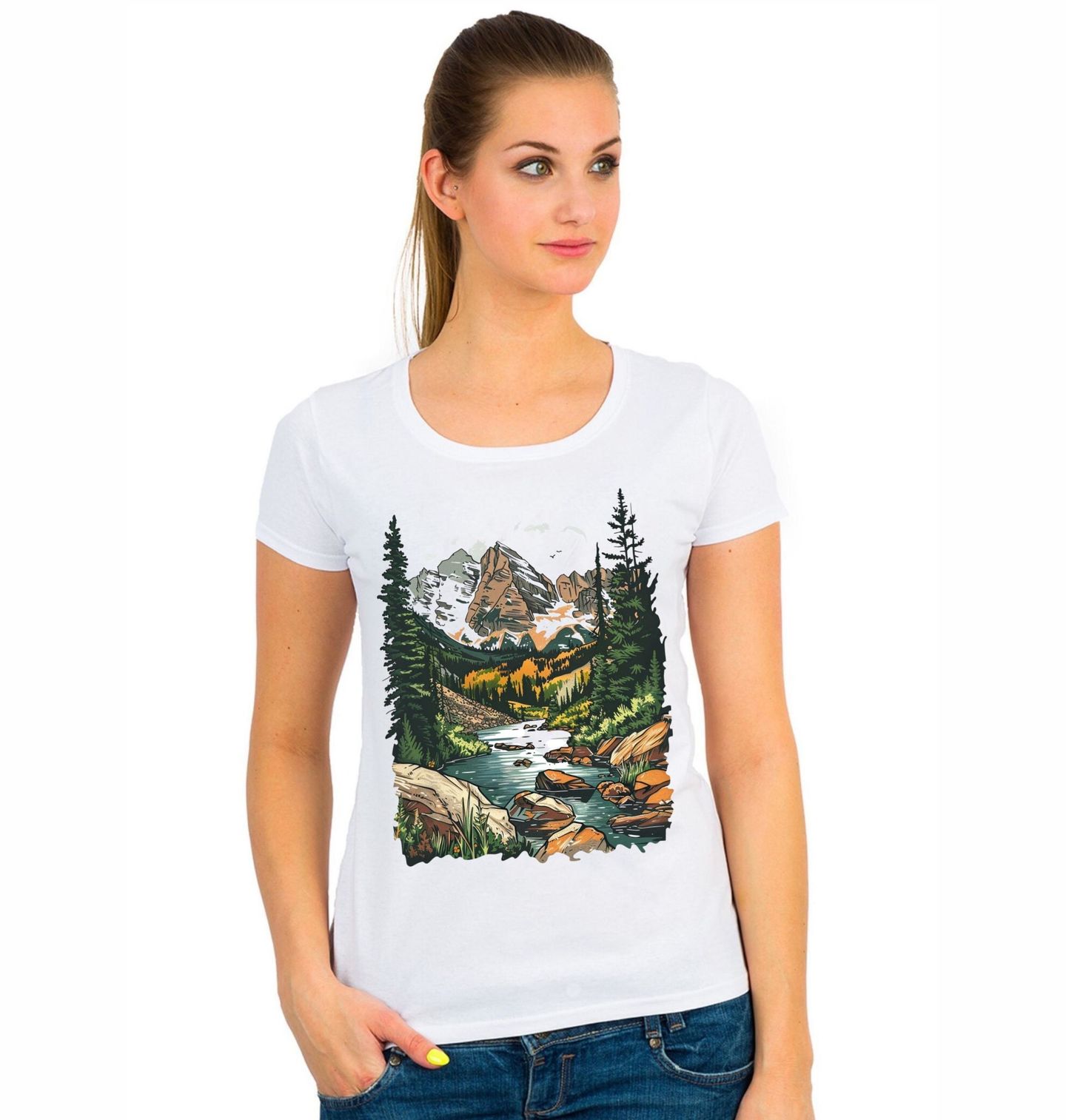 Dámské tričko Horský Potok. Detailní ilustrace horské krajiny s řekou protékající mezi kameny, obklopené lesy a skalnatými vrcholy. Barevné provedení vytváří pocit klidu, čistoty a spojení s přírodou. Tento design je ideální pro milovníky hor, turistiky a relaxace v přírodě.