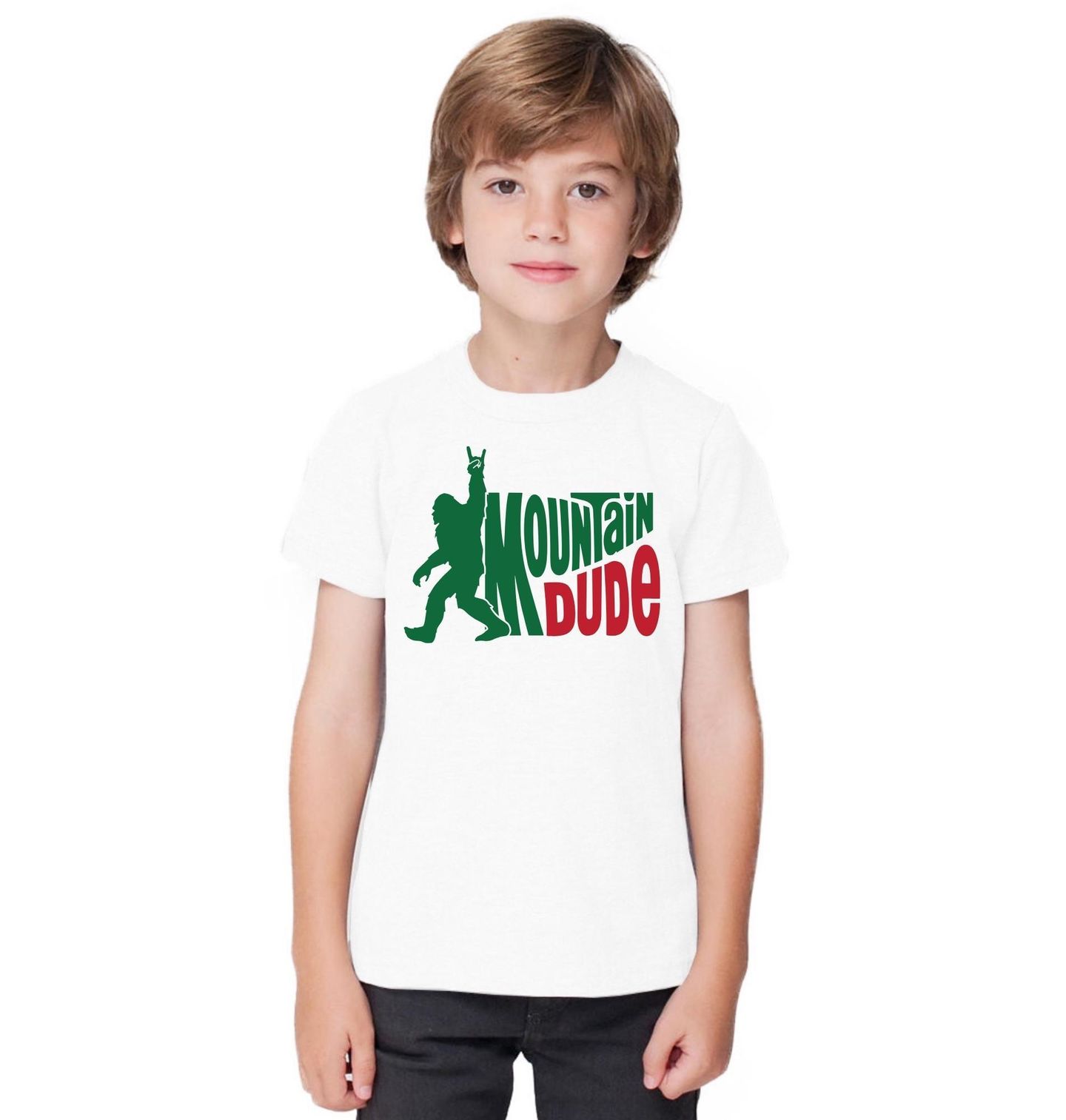 Dětské tričko Horský Týpek Mountain Dude. Nápis „Mountain Dude“ (Horský týpek) s postavou Yettiho. Barvy evokují přírodu a svobodu. Design hory je ideální pro outdoor nadšence.