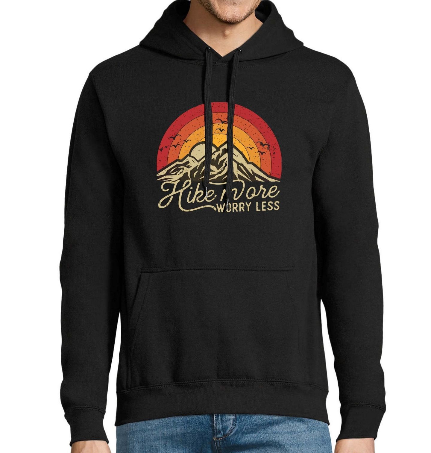 Pánská mikina Horský Západ slunce Hike More Worry Less. Hory léčí, ticho uklidňuje a každý krok tě vzdaluje od každodenního shonu. Nasaď batoh, zhluboka se nadechni a nech starosti v údolí. Protože čím víc se touláš, tím míň se stresuješ.