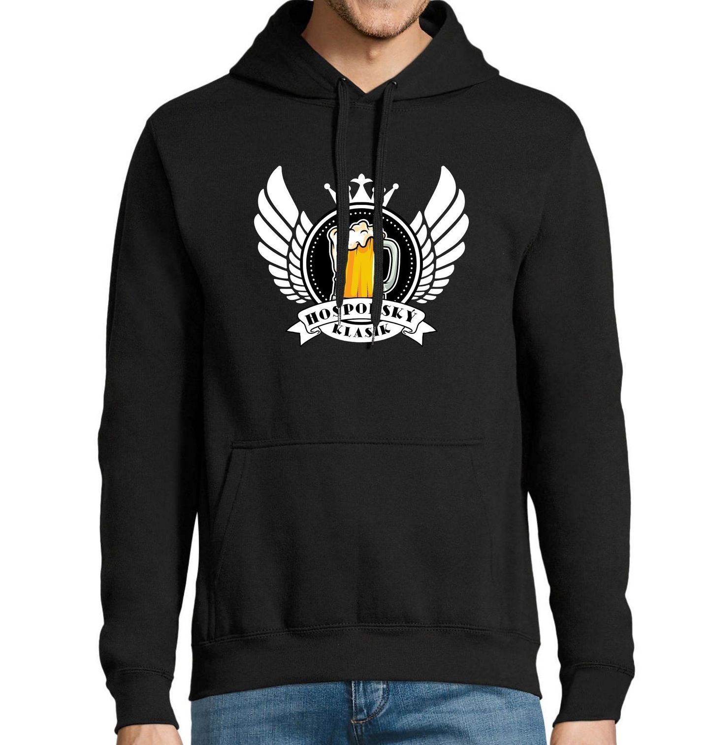 Pánská mikina Hospodský Klasik. Motiv zlatého půllitru s křídly a korunou vyjadřuje, že pivo není jen nápoj – je to životní styl. Ideální pro každého, kdo miluje hospodu, dobré pivo a pohodovou atmosféru. Ať už jsi pravidelný štamgast nebo jen sváteční pivař, tohle tričko ti bude slušet jako královská koruna!