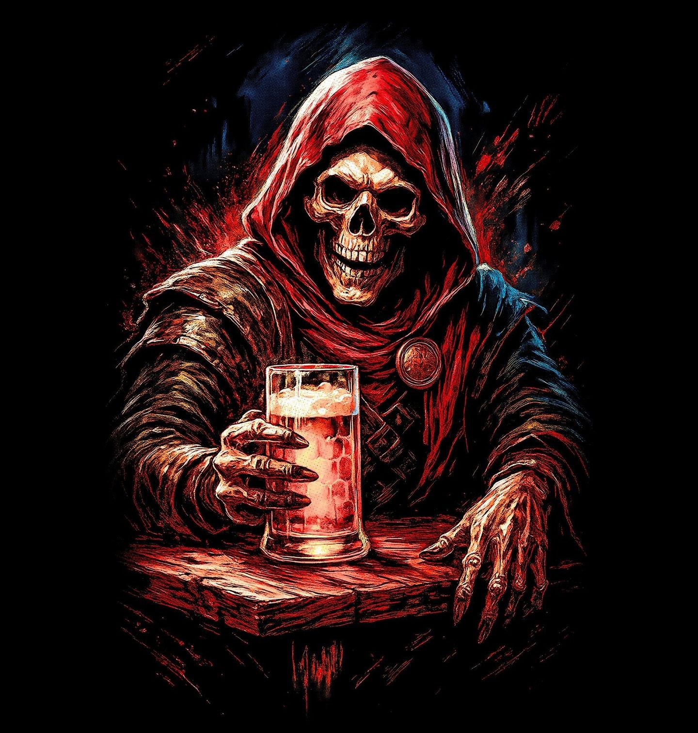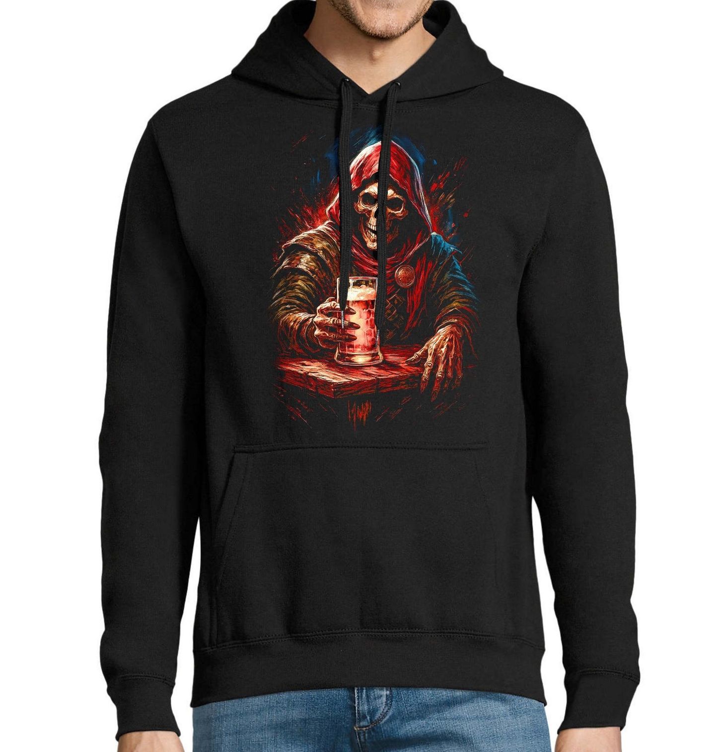 Pánská mikina Hospodský Kostlivec. Detailně zpracovaný kostlivec v kapuci působí jako tajemný host z jiného světa, který si i po smrti dokáže vychutnat dobré pivo. Ideální volba pro fanoušky temného stylu, rockové estetiky i pro ty, kdo berou život s nadhledem a humorem. Tento design kombinuje humor, nadhled i lehce morbidní atmosféru, která zaujme každého milovníka originálních motivů.