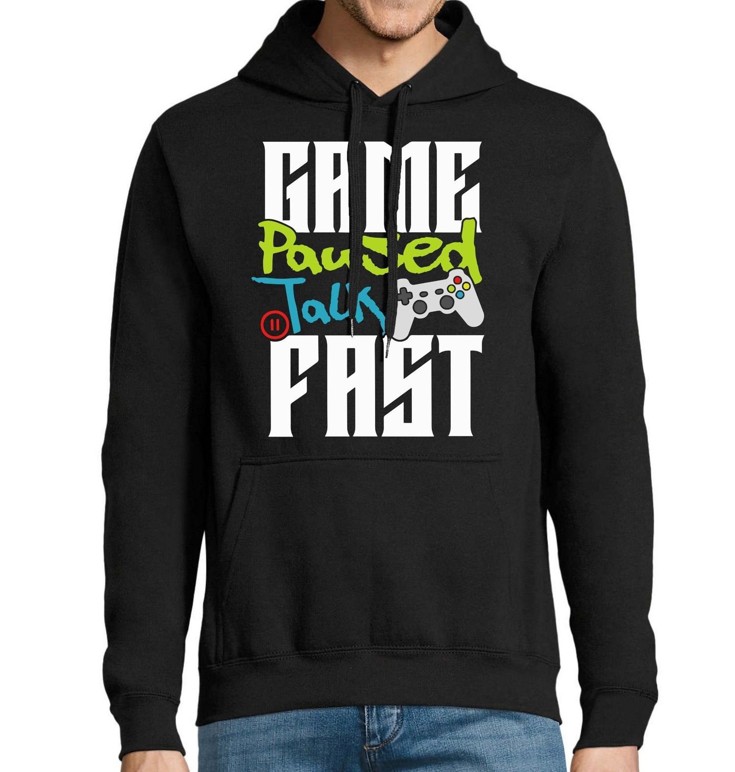 Pánská mikina Hra Pozastavena Mluv Rychle. Tento dynamický grafický návrh je jasným vzkazem pro každého, kdo se odváží vyrušit hráče uprostřed akce. Obrázek kombinuje výraznou bílou typografii s herním ovladačem. Text na obrázku zní: „GAME Paused Talk FAST“, což v překladu znamená „Hra pozastavena, mluv RYCHLE“. Vhodný dárek pro vášnivé gamery.