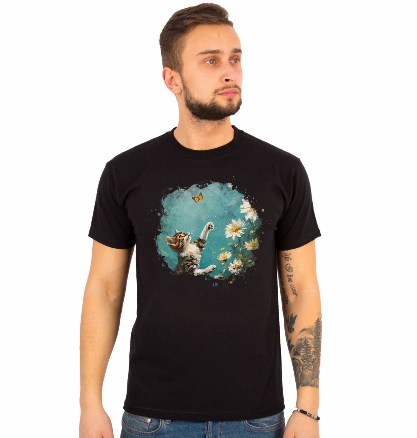 Pánské tričko Hravá Kočka s Motýlem. Něžná a hravá ilustrace zachycuje okamžik, kdy kočka s pozorným pohledem a nataženou tlapkou sleduje poletující motýla nad rozkvetlou loukou. Jemné květiny, pastelové barvy a akvarelová textura vytvářejí lehkou, optimistickou atmosféru plnou léta, svobody a radosti z objevování. Tento motiv je ideální volbou pro milovníky koček, přírody a pozitivních emocí.