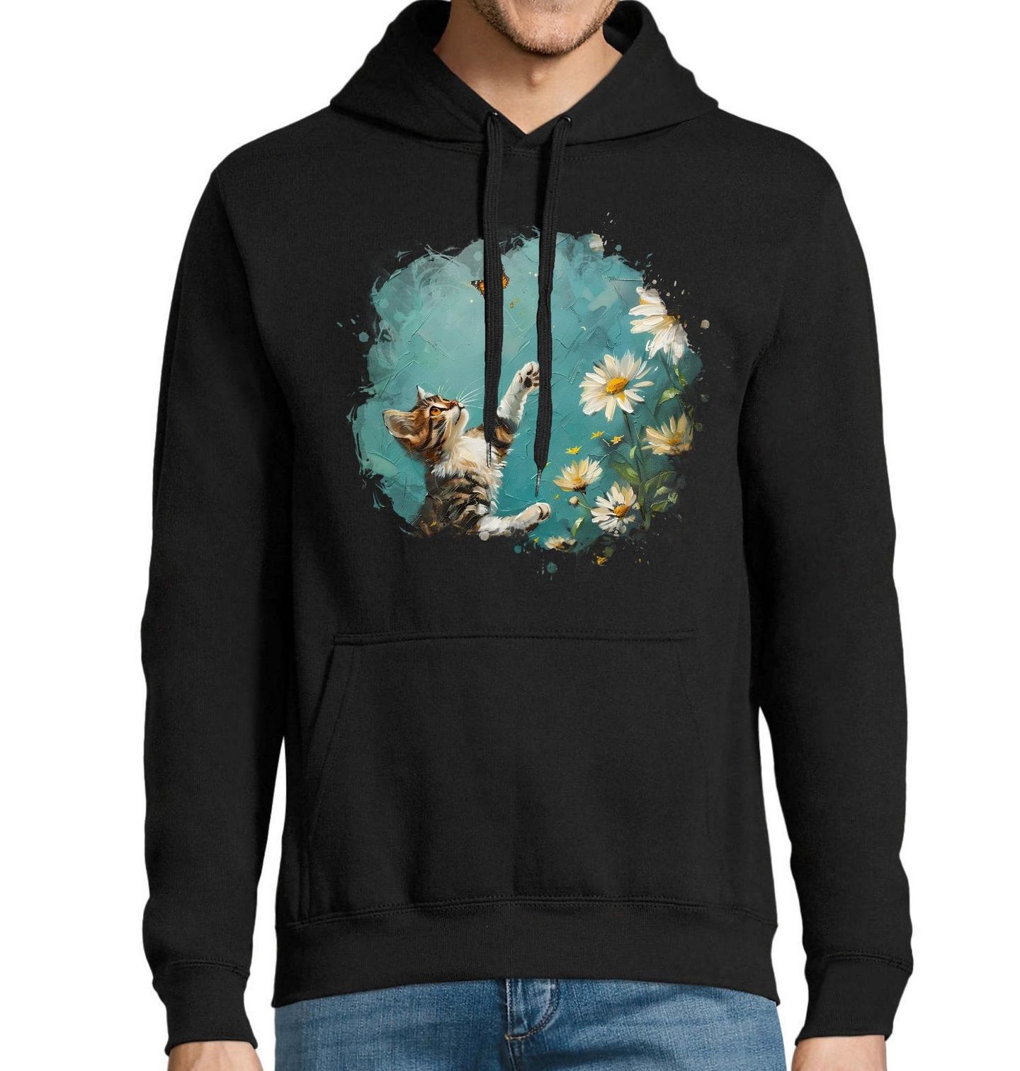 Pánská mikina Hravá Kočka s Motýlem. Něžná a hravá ilustrace zachycuje okamžik, kdy kočka s pozorným pohledem a nataženou tlapkou sleduje poletující motýla nad rozkvetlou loukou. Jemné květiny, pastelové barvy a akvarelová textura vytvářejí lehkou, optimistickou atmosféru plnou léta, svobody a radosti z objevování. Tento motiv je ideální volbou pro milovníky koček, přírody a pozitivních emocí.