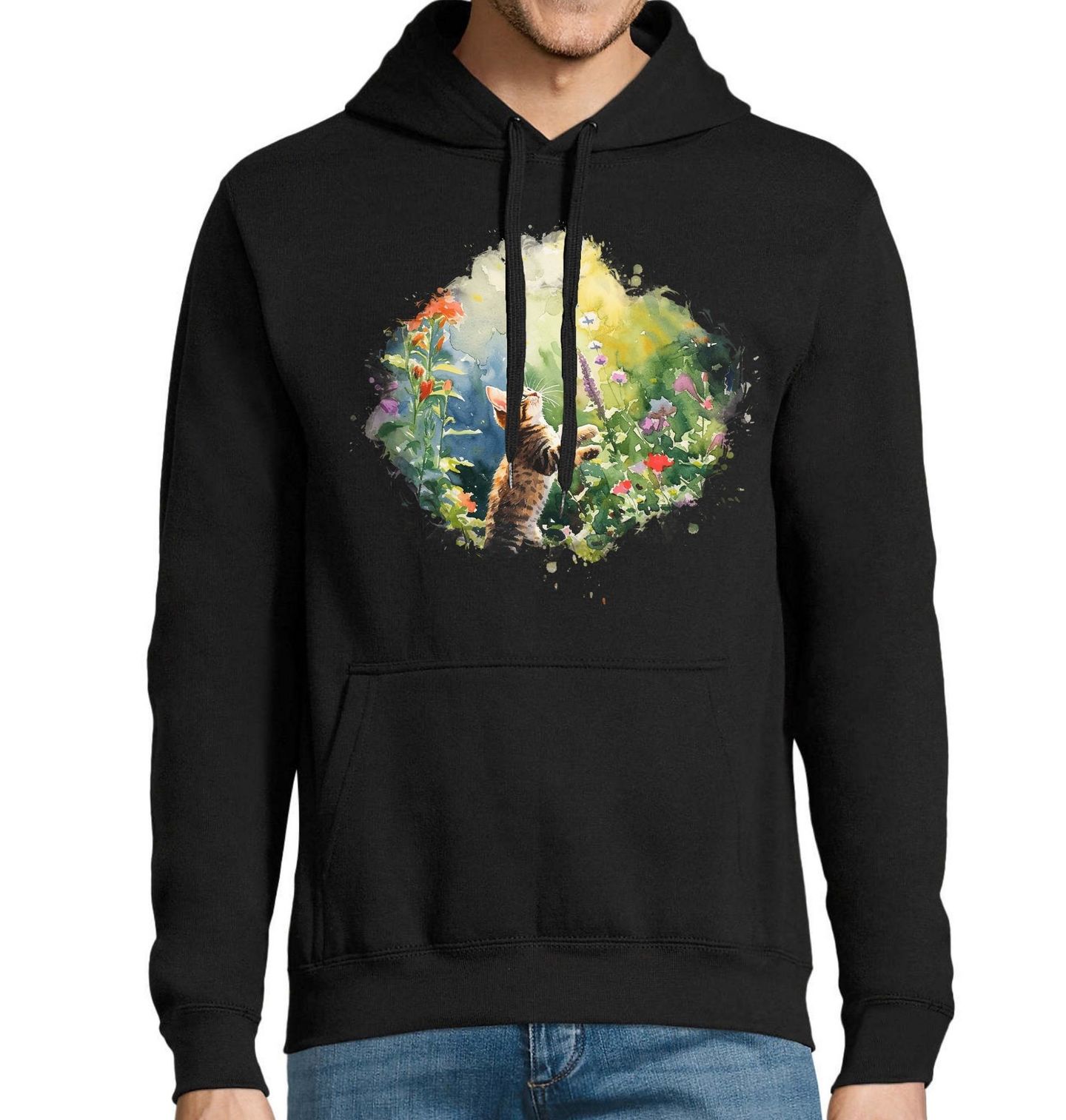 Pánská mikina Hravá Kočka v Zahradě. Jemná ilustrace zachycuje kočka, která se s hravou zvědavostí natahuje za světlem uprostřed rozkvetlé zahrady. Barevné květiny a akvarelový styl vytvářejí pocit klidu, radosti a spojení s přírodou. Kočka zde symbolizuje hravost, svobodu a radost z objevování, zatímco květiny dodávají motivu svěžest a harmonii.