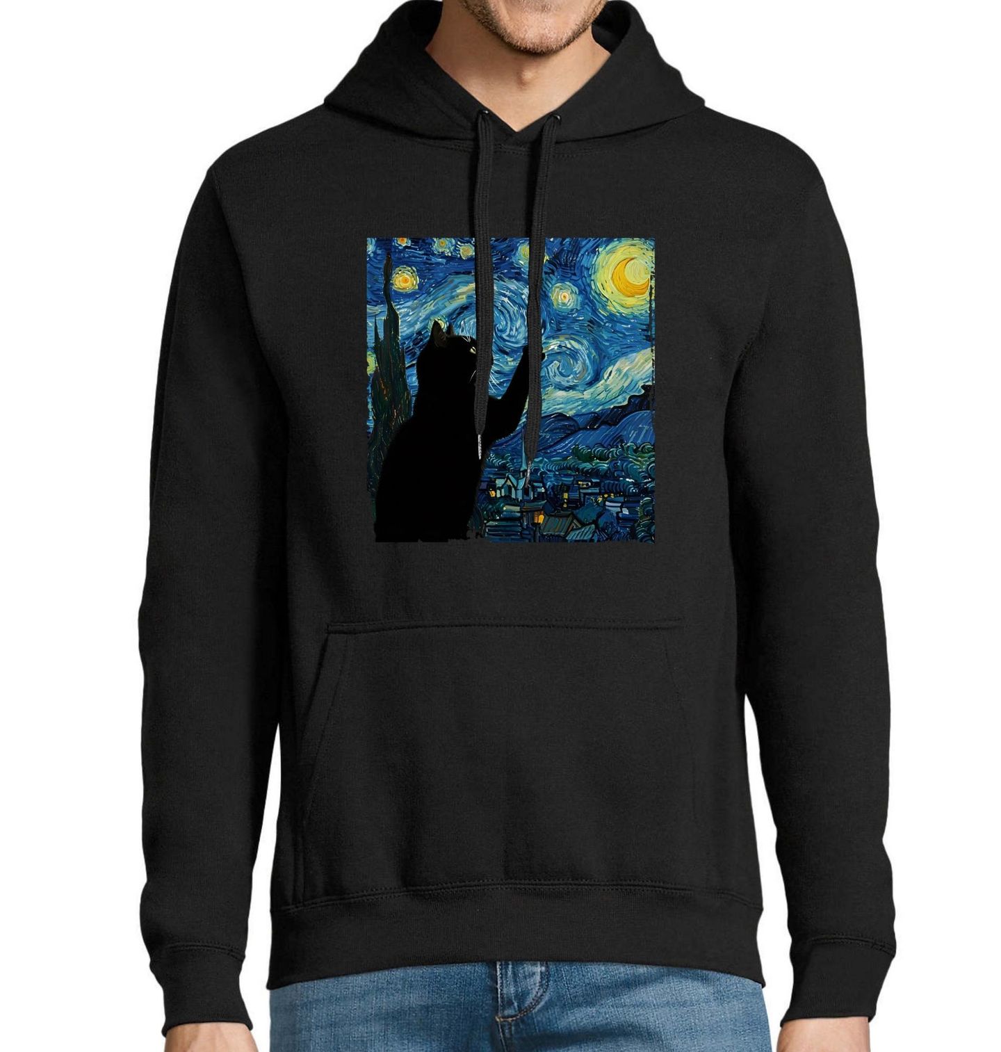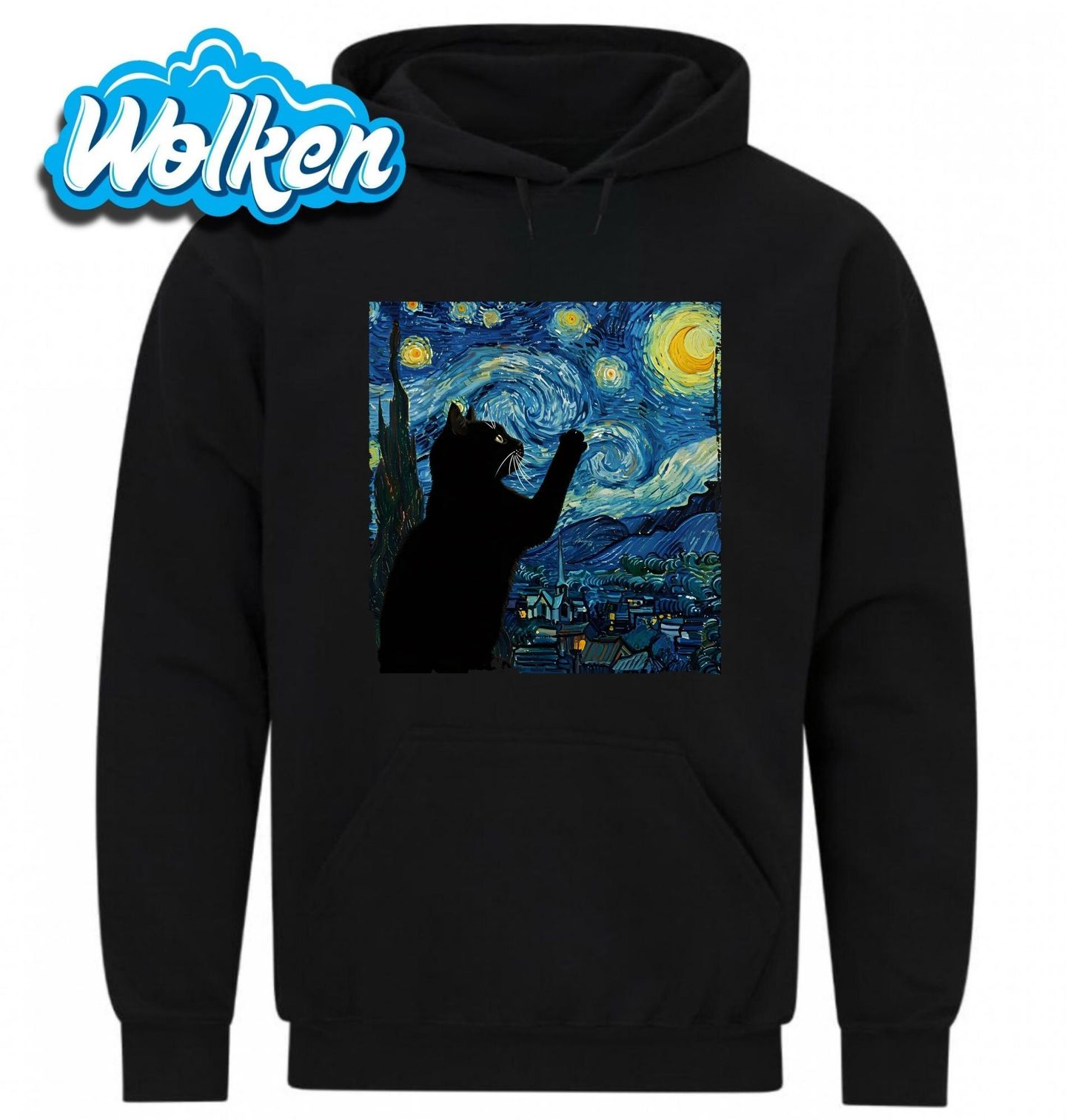 Pánská mikina Hravá Kočka ve Hvězdné Noci. Co by se stalo, kdyby kočky mohly měnit umění? Tento kouzelný motiv spojuje Van Goghovu legendární Hvězdnou noc s hravostí černé kočky. Výsledek? Okouzlující, tajemný a dokonale stylový. Ideální pro milovníky koček, estetiky a hvězdných snů.