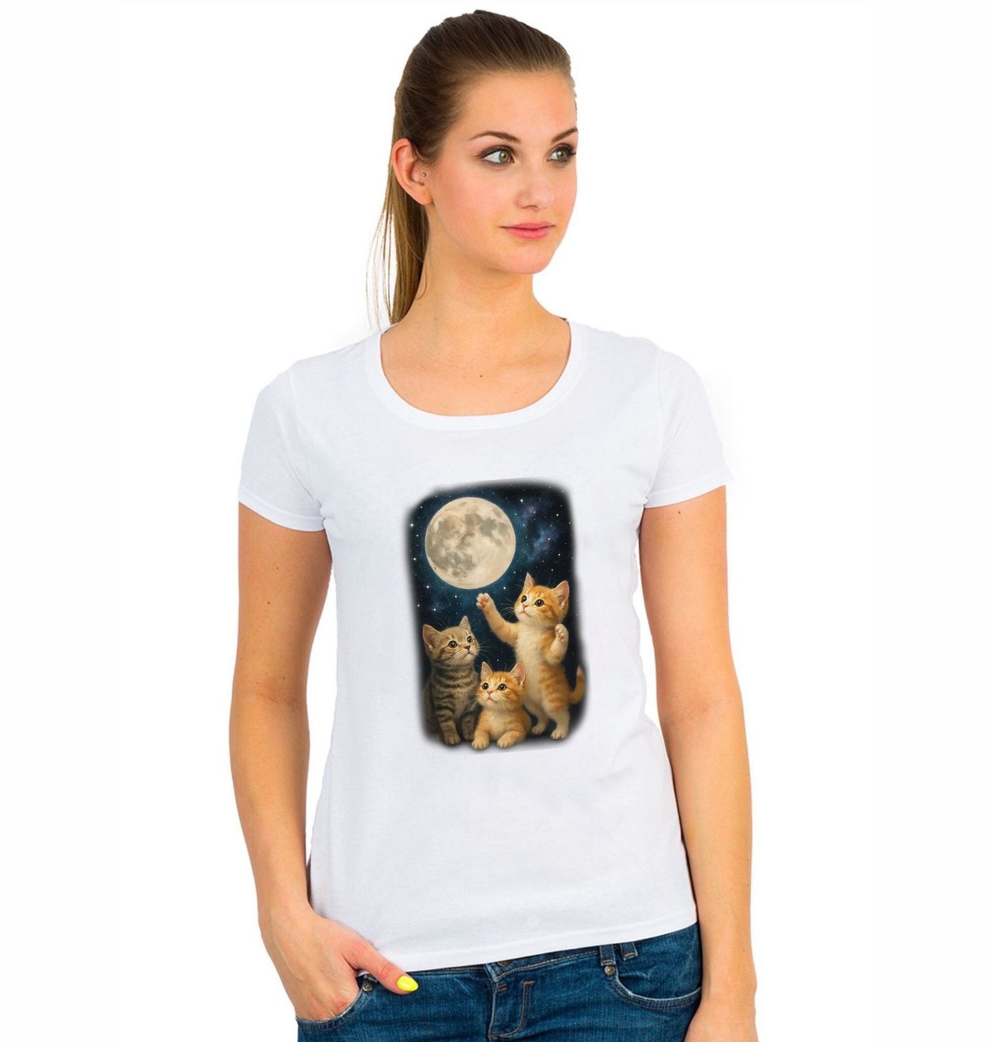 Dámské tričko Hravá Koťata při Úplňku. Jemný a kouzelný motiv, na kterém kotě sleduje zářící měsíc na noční obloze. Celá scéna působí snově, klidně a vyvolává pocit dětské zvědavosti a fantazie. Každá kočka má vlastní výraz a společně vytvářejí harmonický obraz plný emocí a pohody. Kočky pod měsícem osloví milovníky zvířat, snových motivů i jemného umění a přinesou do prostoru pocit tepla a klidu.