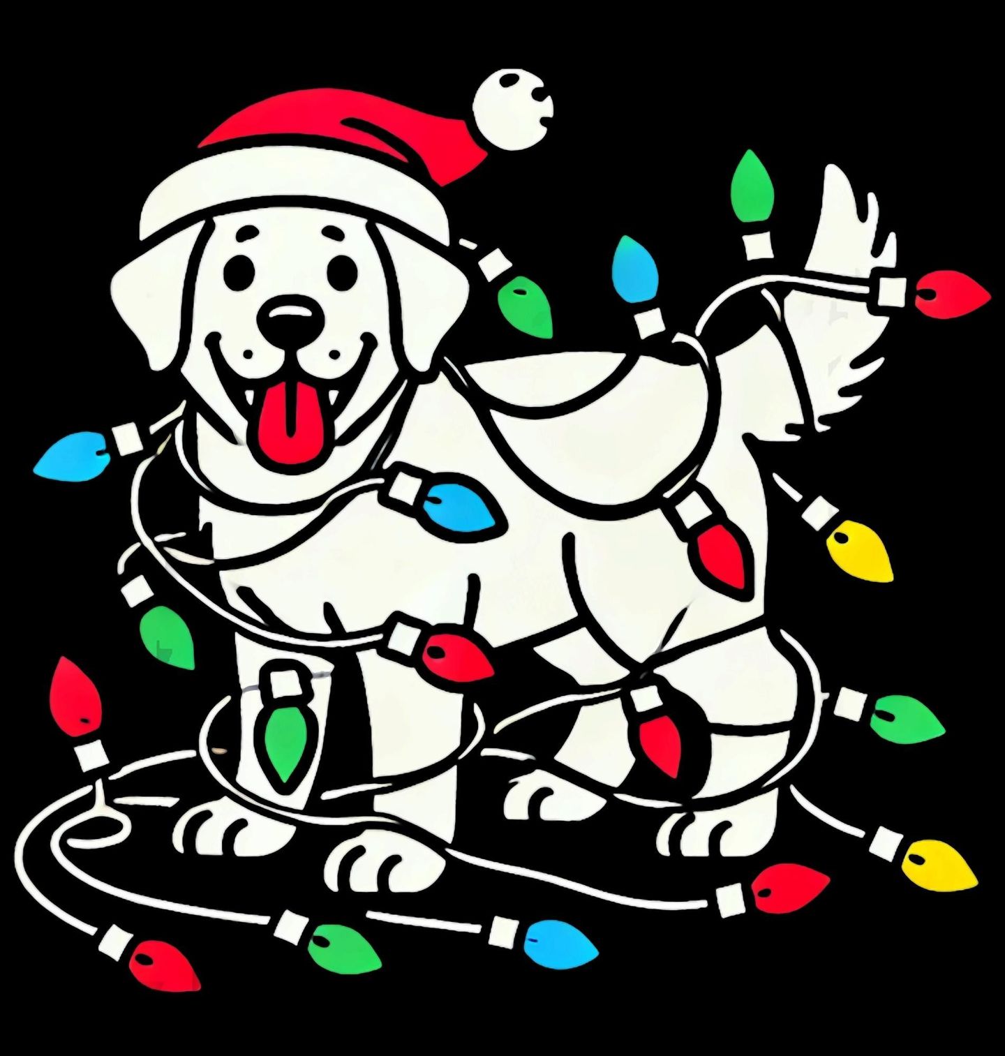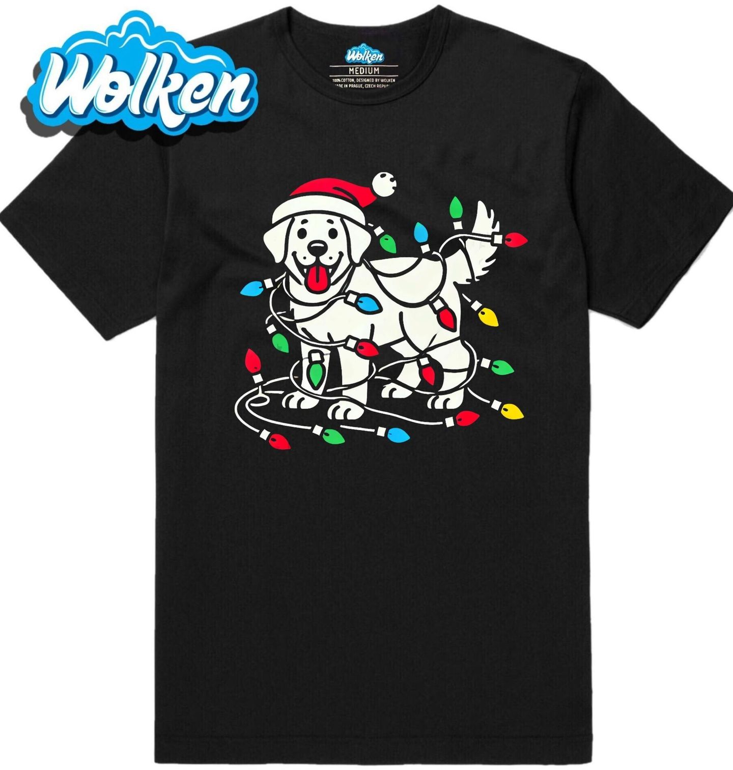 Pánské tričko Hravý Retrívr ve Světýlkách. Rozzařte Vánoce s tímto veselým motivem, na kterém je zlatý retrívr zamotaný do barevných vánočních světýlek a s čepicí Santa Clause na hlavě. Ideální pro každého pejskaře, který miluje svého psa a chce ukázat, že Vánoce bez psího úsměvu prostě nejsou ono.