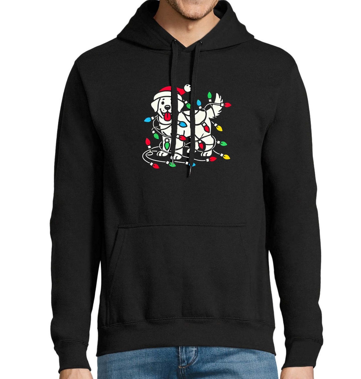 Pánská mikina Hravý Retrívr ve Světýlkách. Rozzařte Vánoce s tímto veselým motivem, na kterém je zlatý retrívr zamotaný do barevných vánočních světýlek a s čepicí Santa Clause na hlavě. Ideální pro každého pejskaře, který miluje svého psa a chce ukázat, že Vánoce bez psího úsměvu prostě nejsou ono.