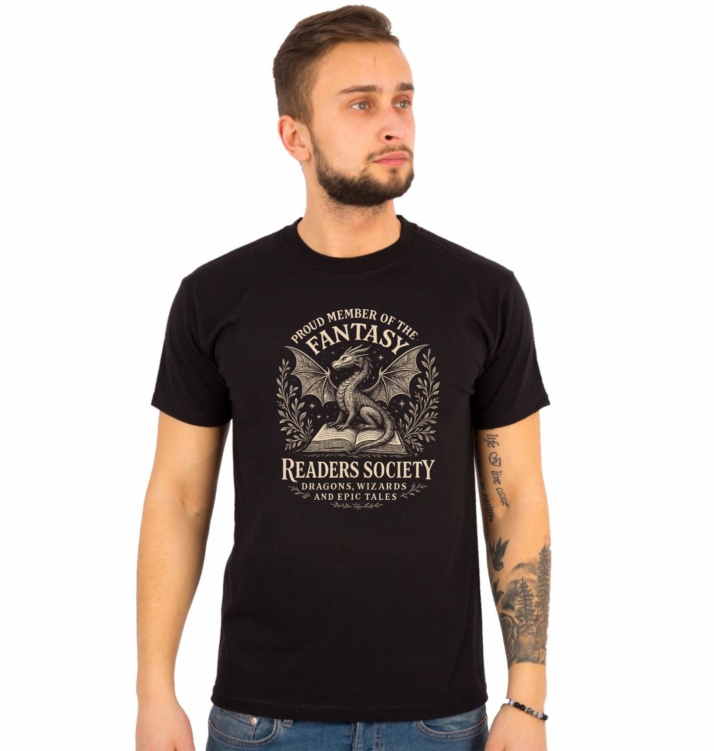 Pánské tričko Hrdý člen Klubu Fantasy Čtenářů. Proud member of the Fantasy Readers Society – Dragons, Wizards and Epic Tales česky „Hrdý člen FANTASY čtenářského spolku – draci, čarodějové a epické příběhy“. Tento magický design osloví každého, kdo miluje knihy, fantasy světy a legendární tvory. Uprostřed otevřené knihy sedí majestátní drak, obklopený listy a hvězdami.