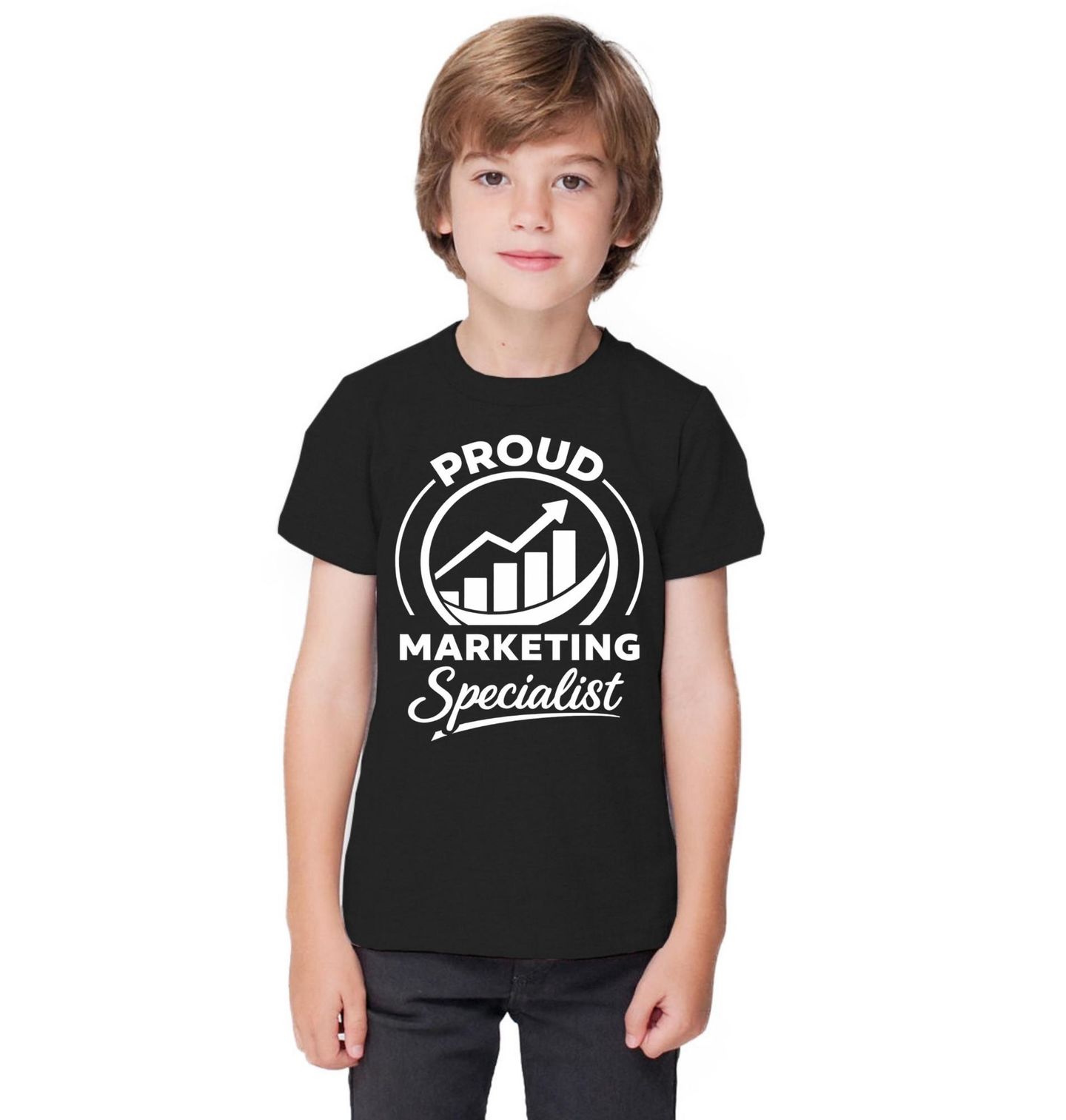 Dětské tričko Hrdý Marketér. Moderní motiv s textem „PROUD MARKETING SPECIALIST“, což znamená „Hrdý marketingový specialista“. Grafika růstu symbolizuje úspěch a kariéru. Tento design je ideální pro profesionály v marketingu.