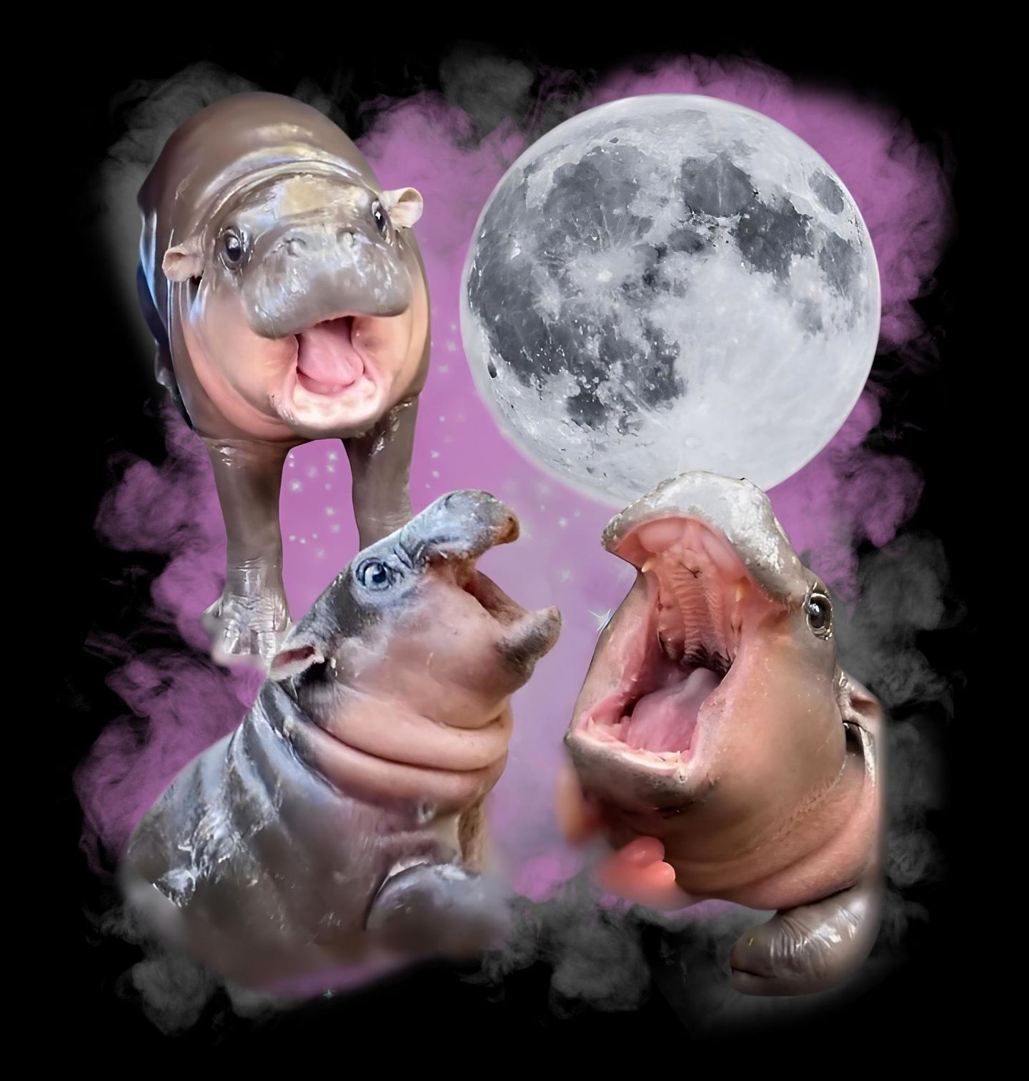 Dámské tričko Hroši vyjící na Měsíc Moo Deng. Hroch pod měsícem? Tady je rovnou trojitá dávka měsíční magie! Tahle parodie na legendární motiv Three Wolf Moon přináší tři roztomilé, ale výmluvné hrochy, kteří se za svitu úplňku dívají do neznáma... nebo jen hledají další porci.
