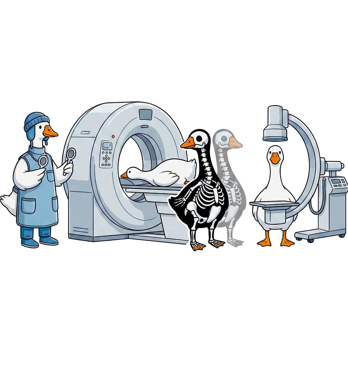 Dámské tričko Husa na Rentgenu. Originální a humorný motiv zobrazuje husa při vyšetření pomocí rentgen, který odhaluje její kostru v zábavném a netradičním stylu. Ilustrace spojuje svět zvířat a zdravotnictví do hravého designu, který pobaví každého na první pohled. Tento motiv je ideální pro všechny, kdo pracují ve zdravotnictví, studují medicínu nebo mají rádi chytrý humor.