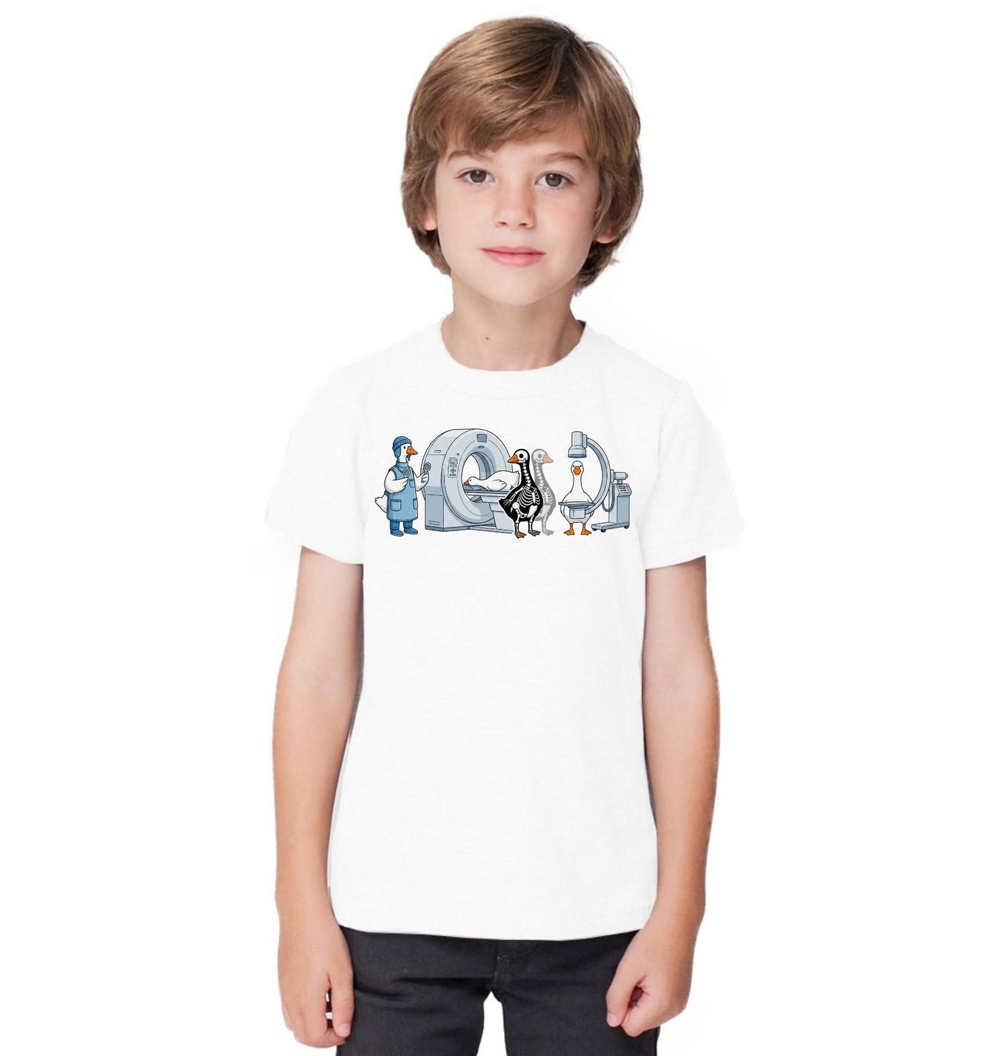 Dětské tričko Husa na Rentgenu. Originální a humorný motiv zobrazuje husa při vyšetření pomocí rentgen, který odhaluje její kostru v zábavném a netradičním stylu. Ilustrace spojuje svět zvířat a zdravotnictví do hravého designu, který pobaví každého na první pohled. Tento motiv je ideální pro všechny, kdo pracují ve zdravotnictví, studují medicínu nebo mají rádi chytrý humor.