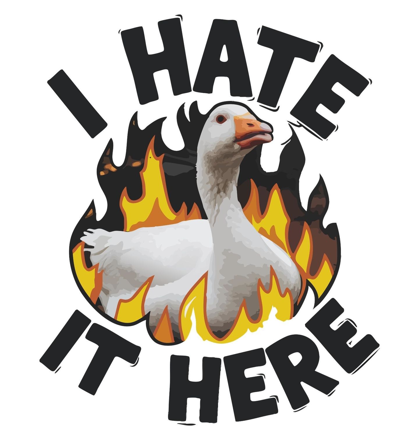 Pánské tričko Husa v Plamenech I Hate It Here. Vtipný a výrazný design zachycuje husu obklopenou plameny, které dodávají celému motivu energii i nadsázku. Text „I Hate It Here“ v překladu znamená „Nesnáším to tady“, což perfektně vystihuje ironickou náladu a humor, který tento motiv přináší.