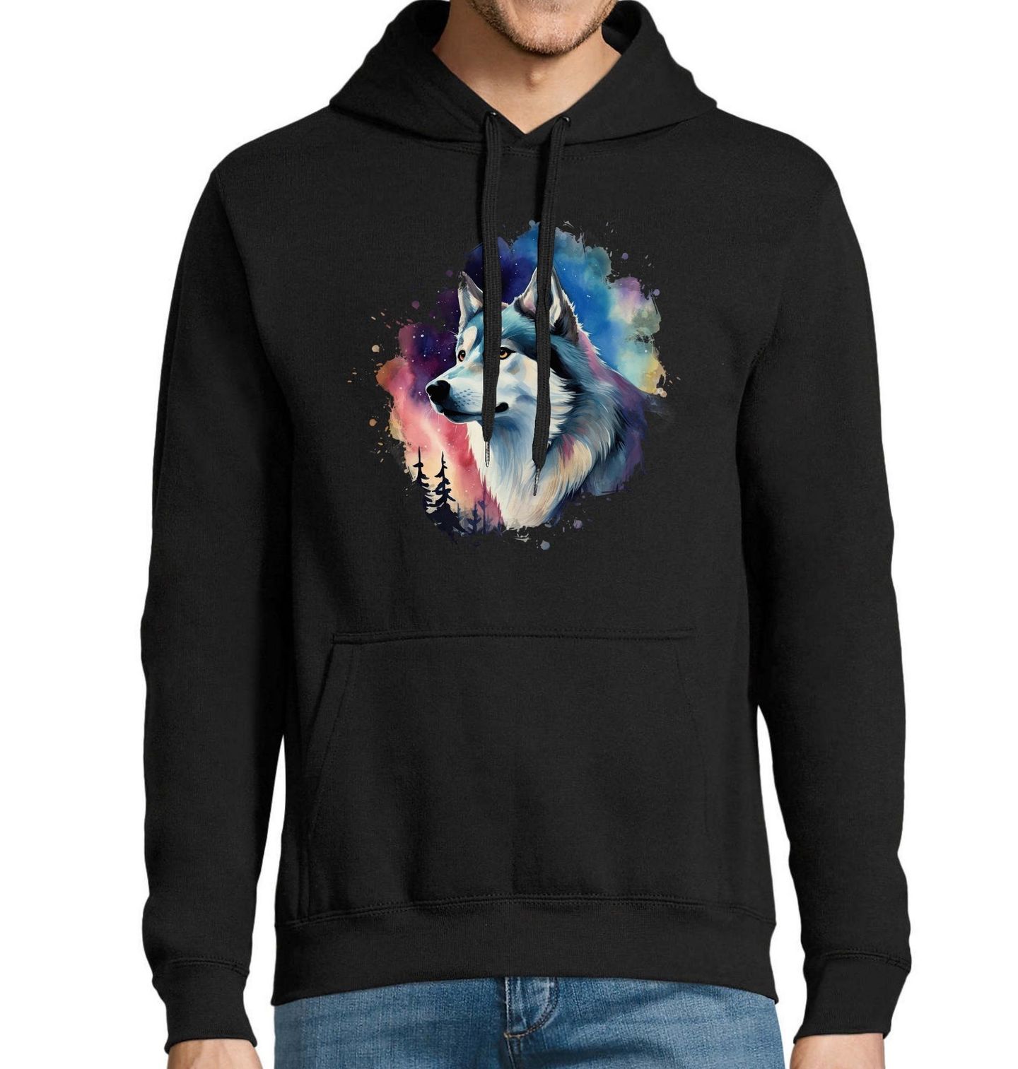 Pánská mikina Husky pod Hvězdami. Sibiřský husky v tichém nočním lese s nebem plným hvězd. Hrdý a klidný pes ztělesňuje svobodu, věrnost a odvahu, která je vlastní tomuto ikonickému severskému plemeni. Perfektní volba pro každého pejskaře, který obdivuje krásu přírody a sílu pouta mezi člověkem a psem.