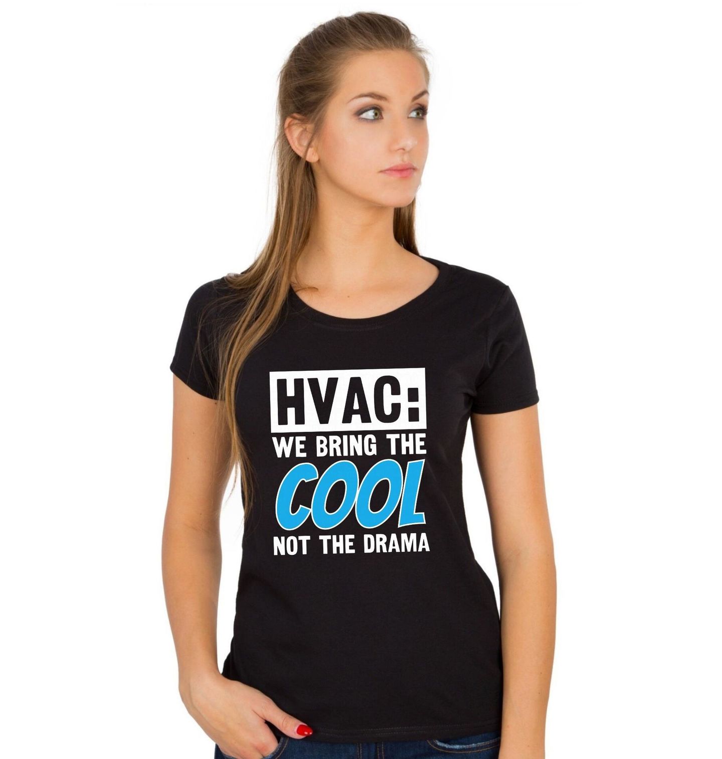 Dámské tričko HVAC bez Dramatu. Výrazný design s nápisem „HVAC: We bring the cool, not the drama“, což v překladu znamená „Přinášíme chlad, ne drama“, jasně vystihuje přístup profesionálů v oboru klimatizace a technického servisu. Motiv zdůrazňuje spolehlivost, klidné řešení problémů a efektivní práci bez zbytečných komplikací.