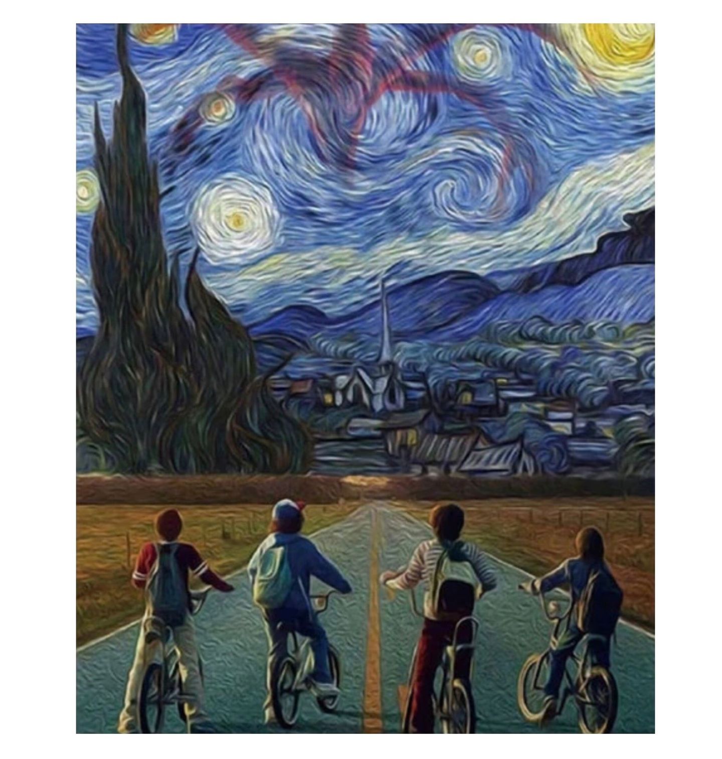 Dětské tričko Hvězdná noc, cesta do Obráceného světa. Hvězdná noc, obraz od nizozemského malíře Vincenta Willema van Gogha. Vyjadřuje noční jev, před kterým právě stojí další dobrodružství skupiny ze Stranger Things. Tričko spojuje svět plný výtvarného umění se světem kinematografie. Pro nadšence filmů a umění je toto tričko jako stvořené.