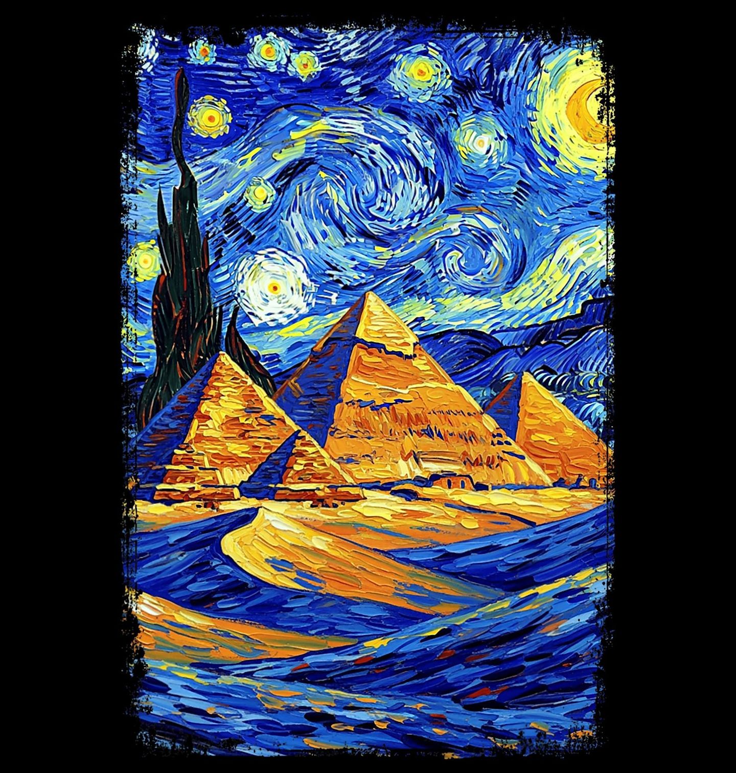 Pánská mikina Hvězdná noc v Egyptě. Hvězdná noc inspirovaná stylem, který proslavil Vincent van Gogh, tentokrát však v netradičním provedení. Tato kreativní parodie přenáší ikonickou malířskou atmosféru do prostředí, které evokuje Egypt, kde dominují majestátní pyramida a pouštní krajina.