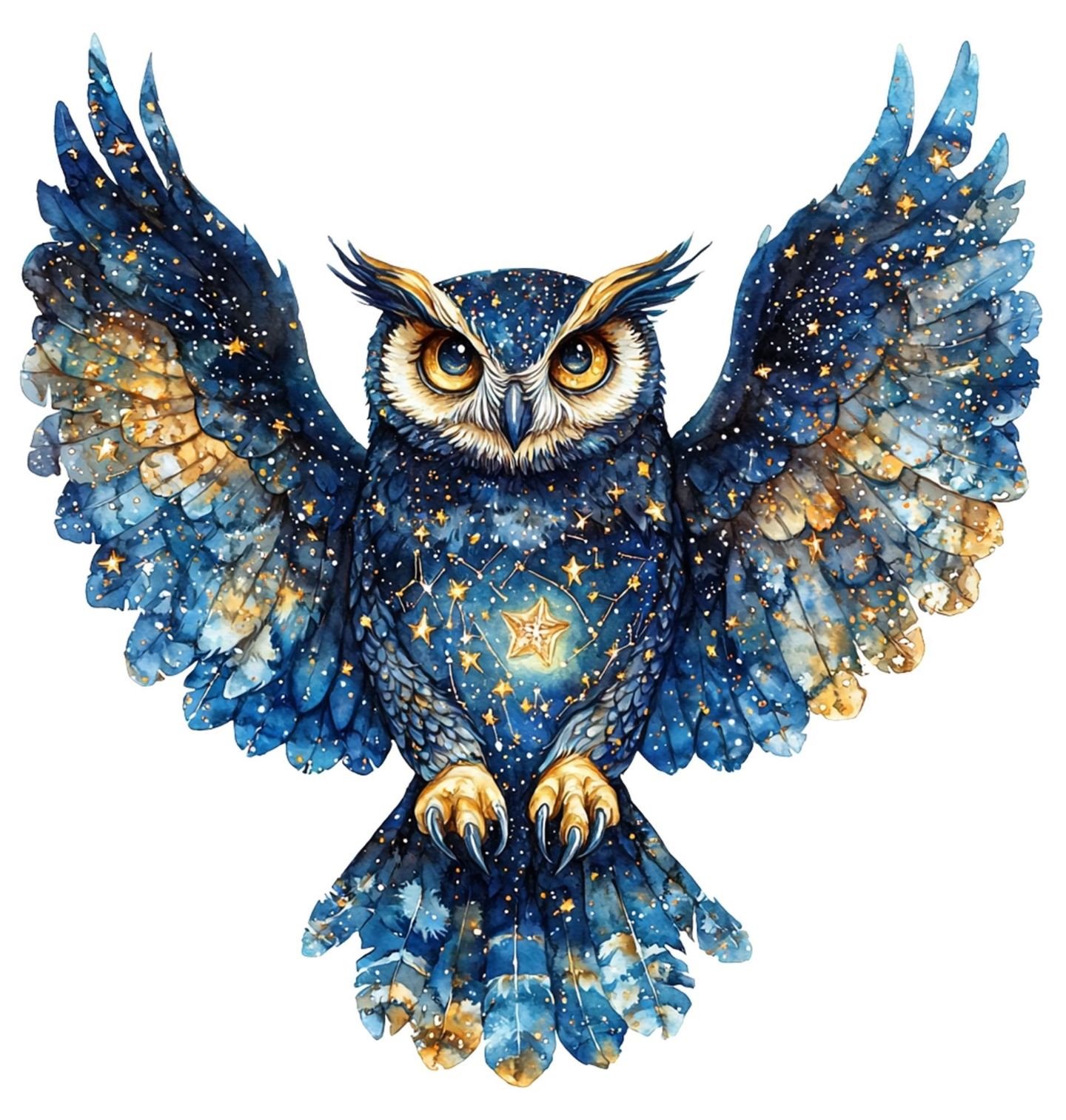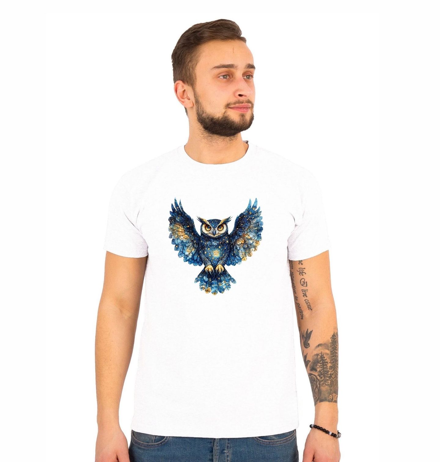 Pánské tričko Hvězdná Sova. Magická sova s roztaženými křídly je zahalená do motivů, které připomínají vesmír plný světla, hloubky a energie. Jemné detaily a zářivé hvězdy vytvářejí dojem kosmické bytosti, která symbolizuje moudrost, intuici a ochranu.