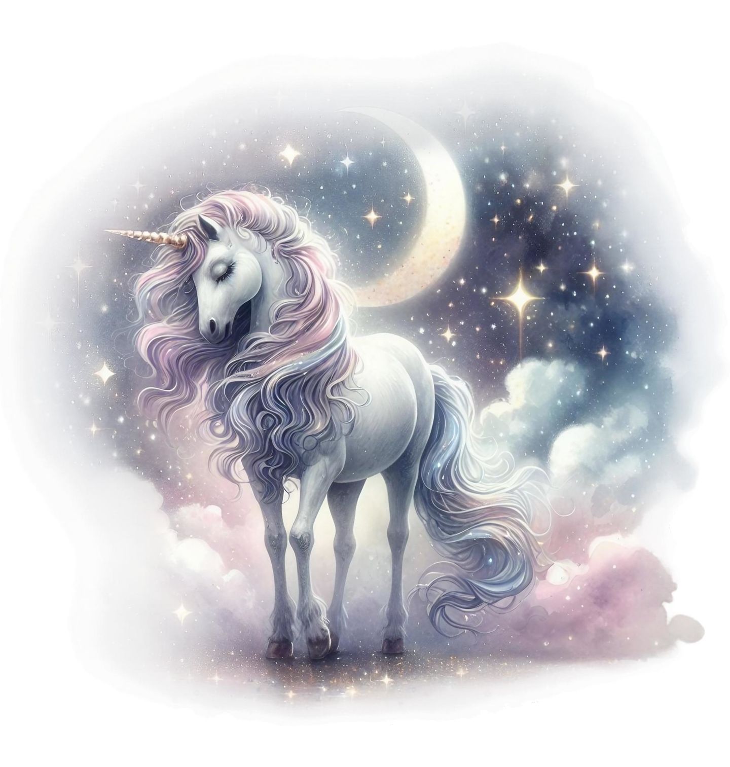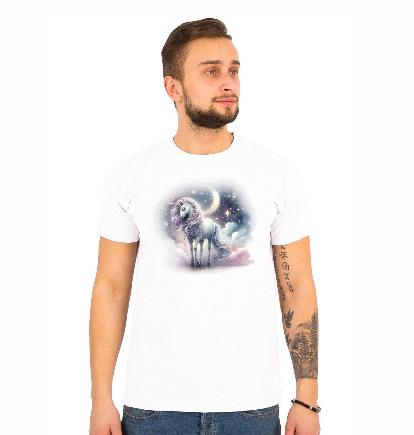 Pánské tričko Hvězdný Jednorožec. Vstup do kouzelného světa snů s tímto nádherným motivem, kde hraje hlavní roli jednorožec se zářivou hřívou ve světle měsíce a hvězd. Obklopený mraky a jemnými pastelovými tóny působí tento jednorožec jako strážce pohádkových snů a fantazie.