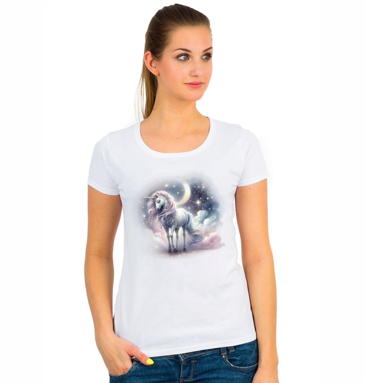 Dámské tričko Hvězdný Jednorožec. Vstup do kouzelného světa snů s tímto nádherným motivem, kde hraje hlavní roli jednorožec se zářivou hřívou ve světle měsíce a hvězd. Obklopený mraky a jemnými pastelovými tóny působí tento jednorožec jako strážce pohádkových snů a fantazie.