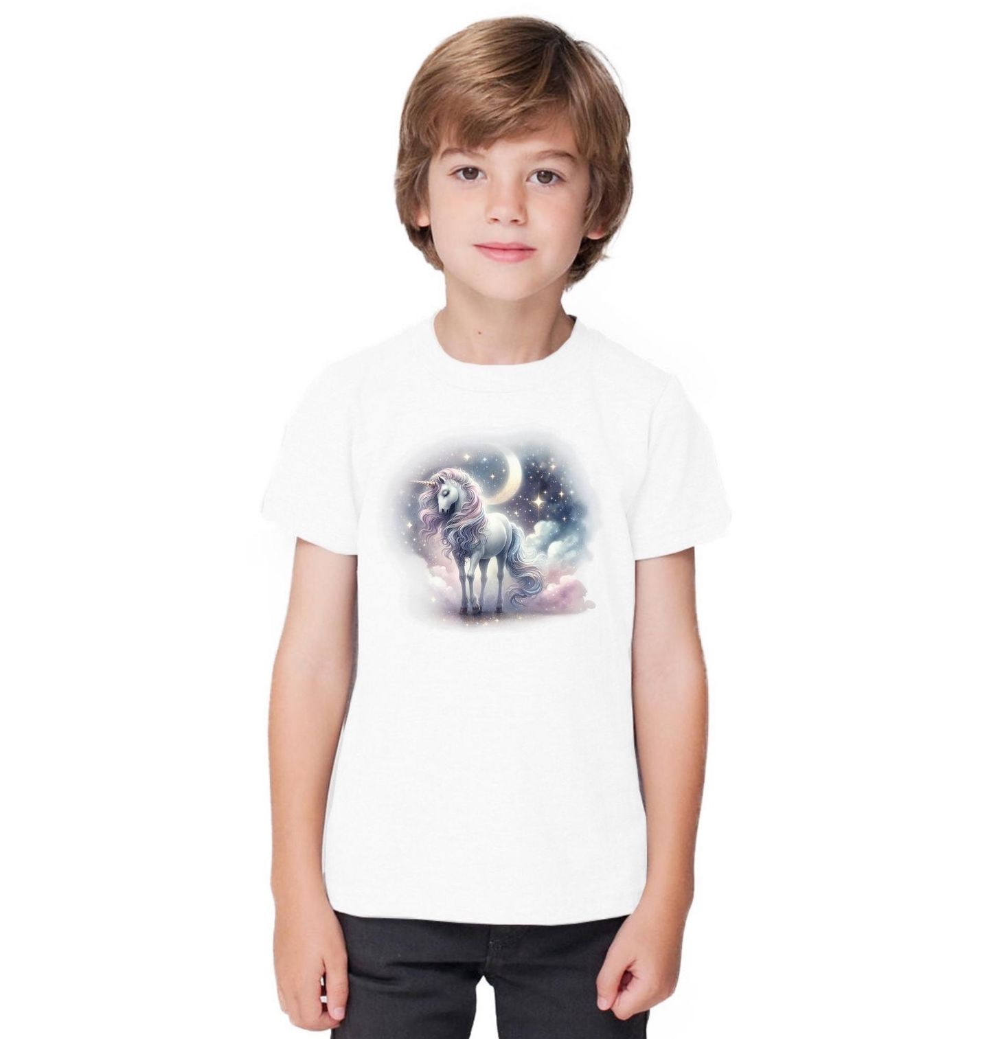 Dětské tričko Hvězdný Jednorožec. Vstup do kouzelného světa snů s tímto nádherným motivem, kde hraje hlavní roli jednorožec se zářivou hřívou ve světle měsíce a hvězd. Obklopený mraky a jemnými pastelovými tóny působí tento jednorožec jako strážce pohádkových snů a fantazie.