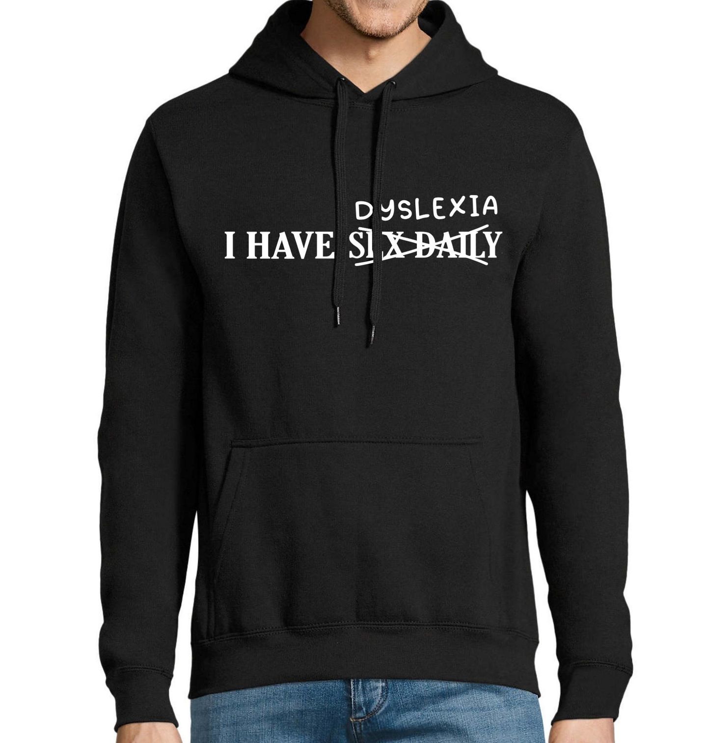 Pánská mikina I have Dyslexia. Minimalistický textový design staví na humoru a sarkasmus, který pochopí každý fanoušek slovních hříček. Na motivu je anglický nápis „I have sex daily“, který je přeškrtnutý a doplněný slovem „dyslexia“ – pointa vtipu je v přeházených písmenech a ironickém významu.