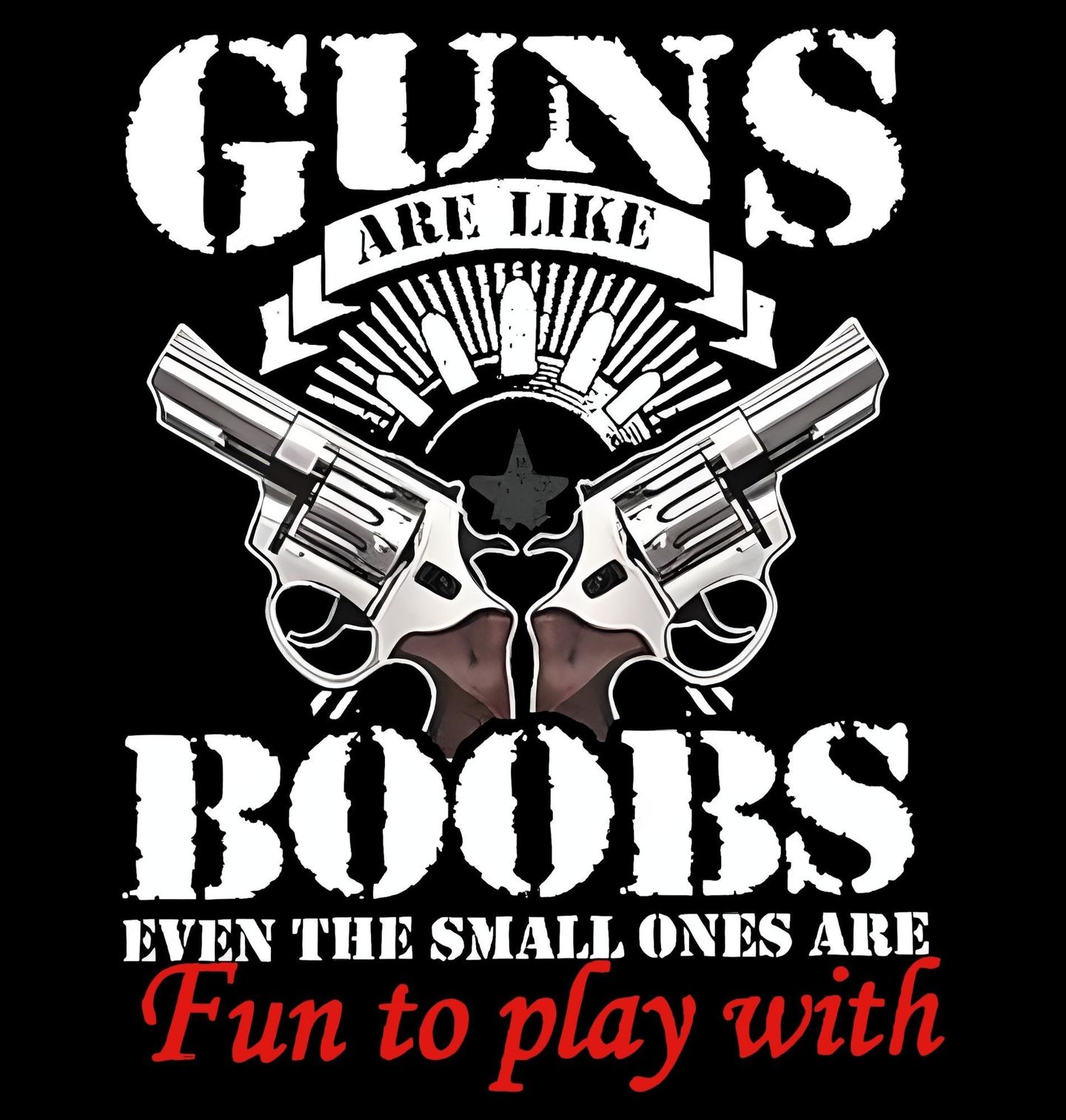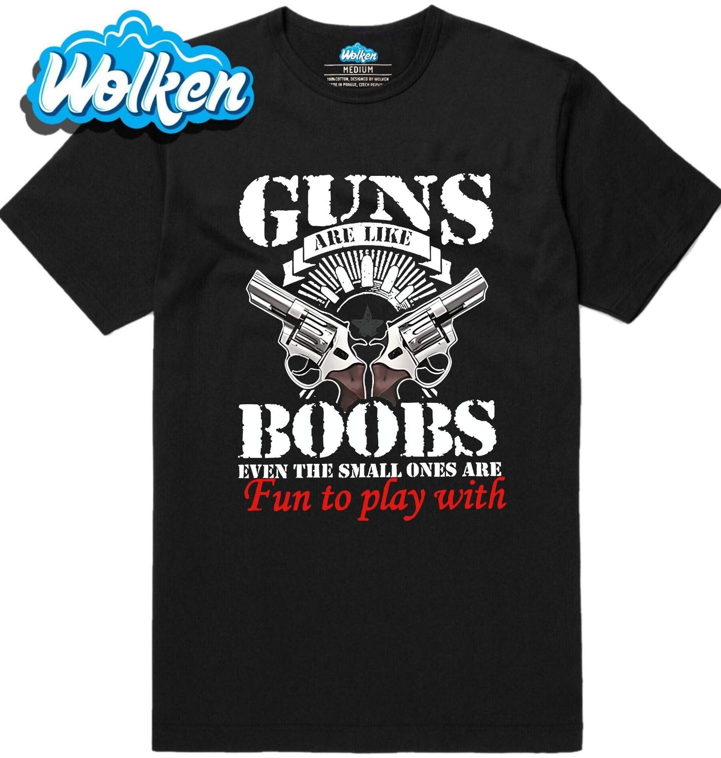 Pánské tričko I malá prsa a zbraně jsou zábavná. „Guns are like boobs – even the small ones are fun to play with“ („Zbraně jsou jako prsa – i těmi malými je zábava si hrát“). Vtipný a odvážný potisk, který rozhodně přitáhne pozornost. Ideální pro fanoušky střelby, zbraní i odlehčené nadsázky.