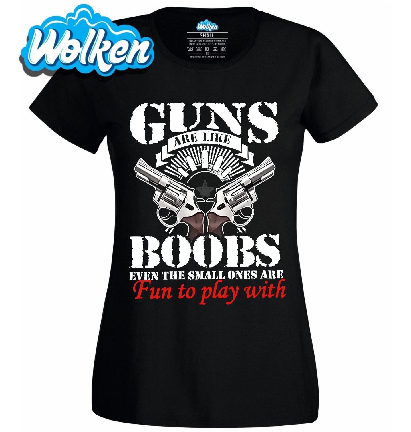 Dámské tričko I malá prsa a zbraně jsou zábavná. „Guns are like boobs – even the small ones are fun to play with“ („Zbraně jsou jako prsa – i těmi malými je zábava si hrát“). Vtipný a odvážný potisk, který rozhodně přitáhne pozornost. Ideální pro fanoušky střelby, zbraní i odlehčené nadsázky.