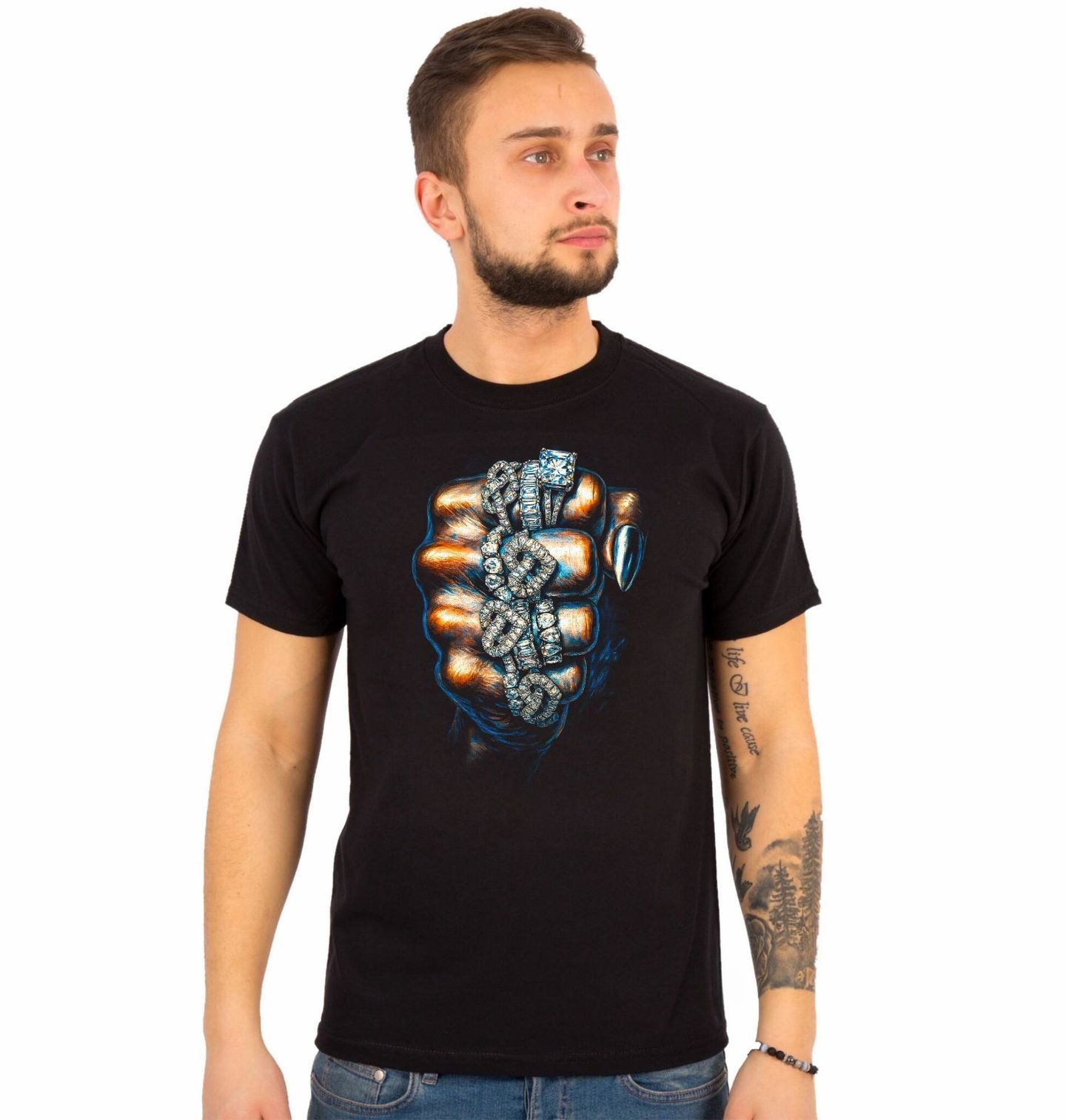 Pánské tričko Iced Chain. Luxus, síla a nekompromisní styl v jednom motivu. Detailně zpracovaná pěst svírá masivní chain zdobený prvky, které připomínají diamant zasazený do lesklého kovu ve stylu stříbro. Tento design reprezentuje moc, sebevědomí a streetovou eleganci, která nepřehlédnutelně vynikne. Dominantní diamant a výrazný chain vytváří ikonický „iced-out“ vzhled, který je symbolem moderního streetwearu.