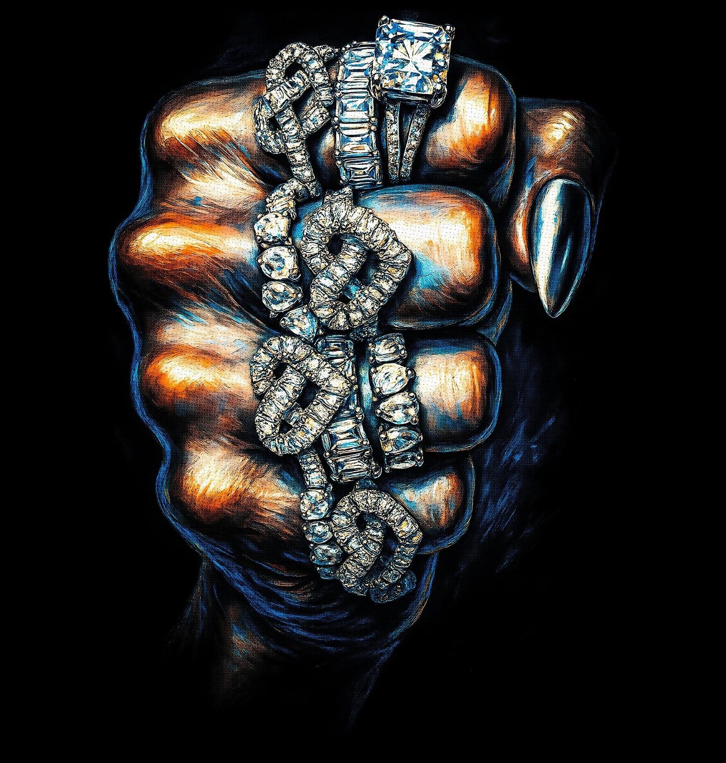 Dámské tričko Iced Chain. Luxus, síla a nekompromisní styl v jednom motivu. Detailně zpracovaná pěst svírá masivní chain zdobený prvky, které připomínají diamant zasazený do lesklého kovu ve stylu stříbro. Tento design reprezentuje moc, sebevědomí a streetovou eleganci, která nepřehlédnutelně vynikne. Dominantní diamant a výrazný chain vytváří ikonický „iced-out“ vzhled, který je symbolem moderního streetwearu.