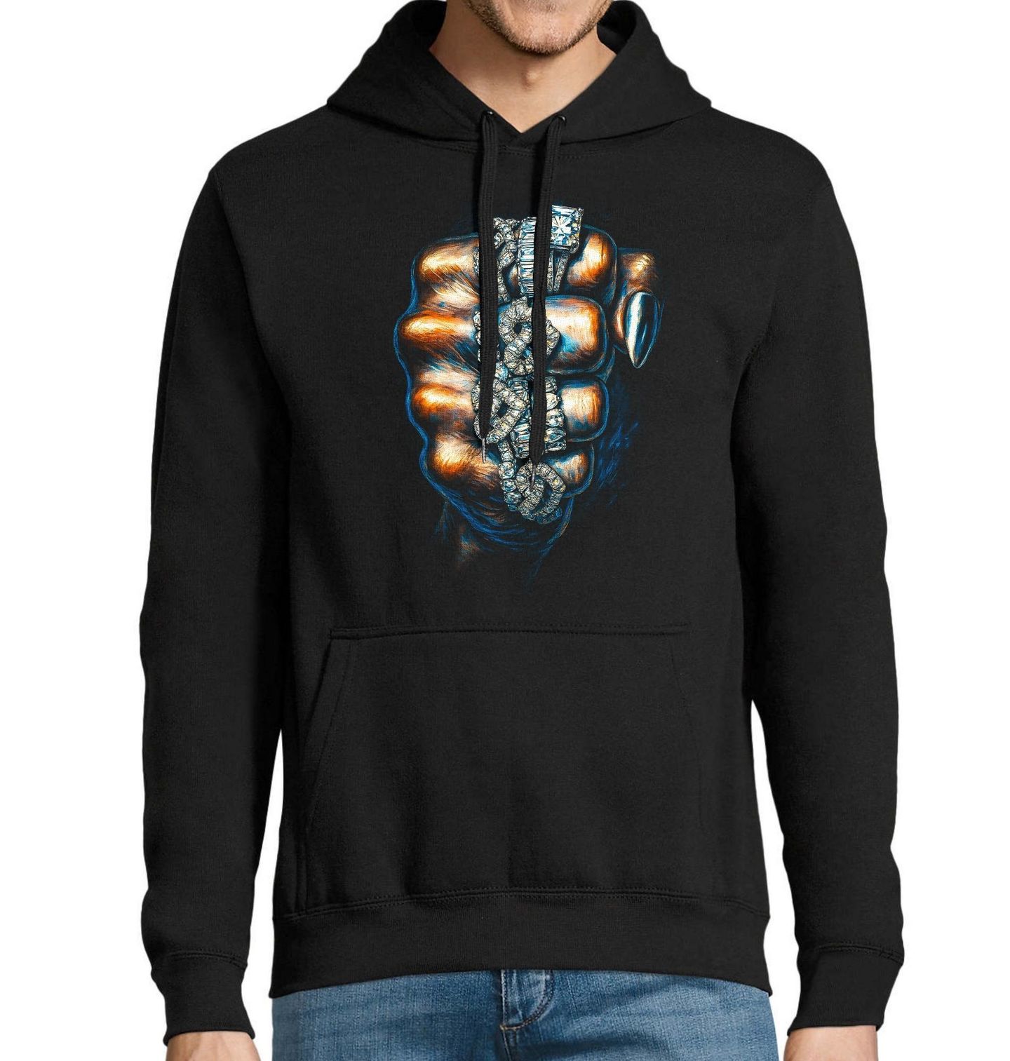 Pánská mikina Iced Chain. Luxus, síla a nekompromisní styl v jednom motivu. Detailně zpracovaná pěst svírá masivní chain zdobený prvky, které připomínají diamant zasazený do lesklého kovu ve stylu stříbro. Tento design reprezentuje moc, sebevědomí a streetovou eleganci, která nepřehlédnutelně vynikne. Dominantní diamant a výrazný chain vytváří ikonický „iced-out“ vzhled, který je symbolem moderního streetwearu.