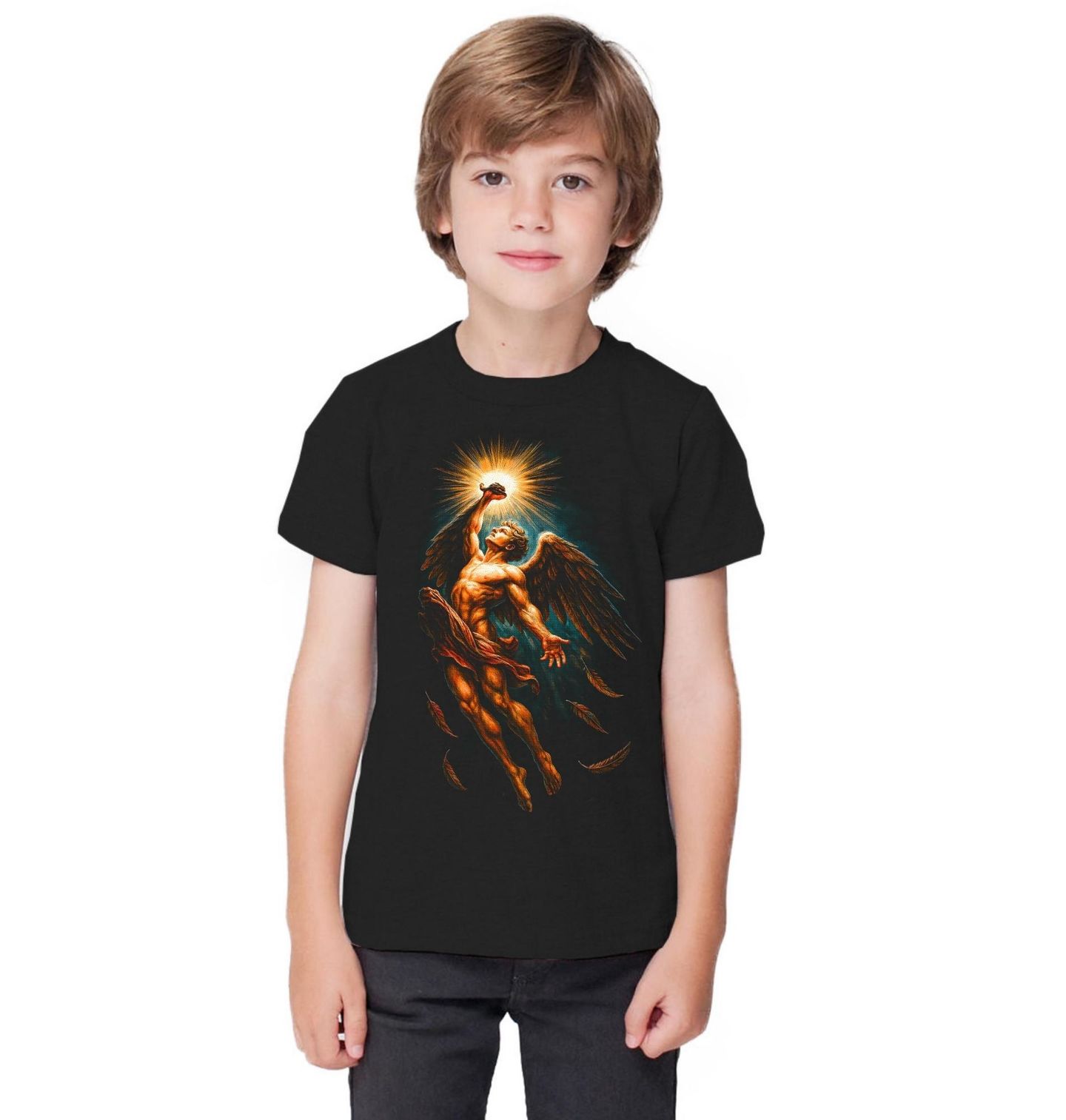 Dětské tričko Íkaros Příliš Blízko Slunci. Podle příběhu, který vypráví řecká mytologie, si Íkaros spolu se svým otcem Daidalem vyrobil křídla z peří a vosku, aby unikli z Kréty. Přes varování však vzlétl příliš vysoko, slunce vosk roztavilo a on se zřítil do moře. Stal se symbolem odvahy, svobody i lidské pýchy. Řecká mytologie vypráví jeho příběh jako varování před pýchou, ale také jako oslavu lidské odvahy snít a vzlétnout.