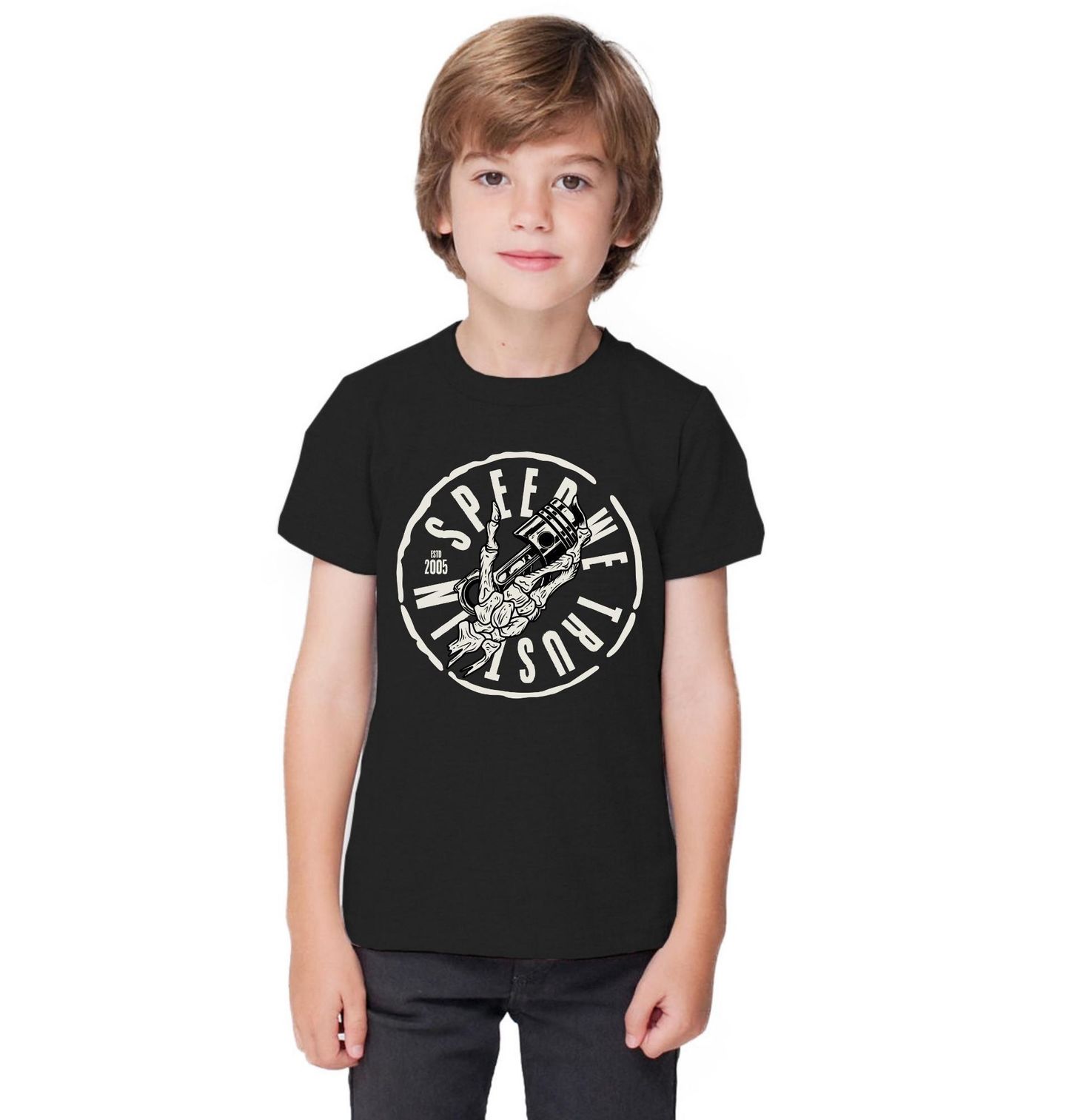 Dětské tričko In Speed We Trust. Text „In Speed We Trust“ znamená v překladu „V rychlost věříme“ – parafráze známého sloganu, převedená do světa upravených strojů, závodní kultury a garážových projektů. Nápis „ESTD 2005“ znamená „založeno 2005“ a dodává motivu autentický vzhled značky nebo komunity zaměřené na výkon a tuning.