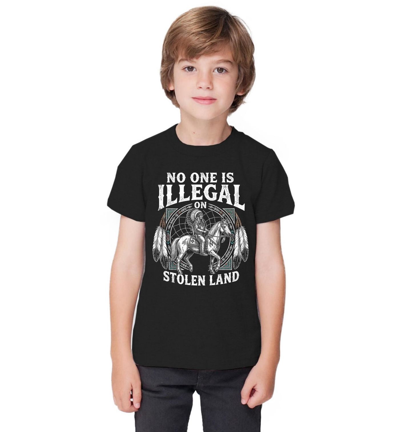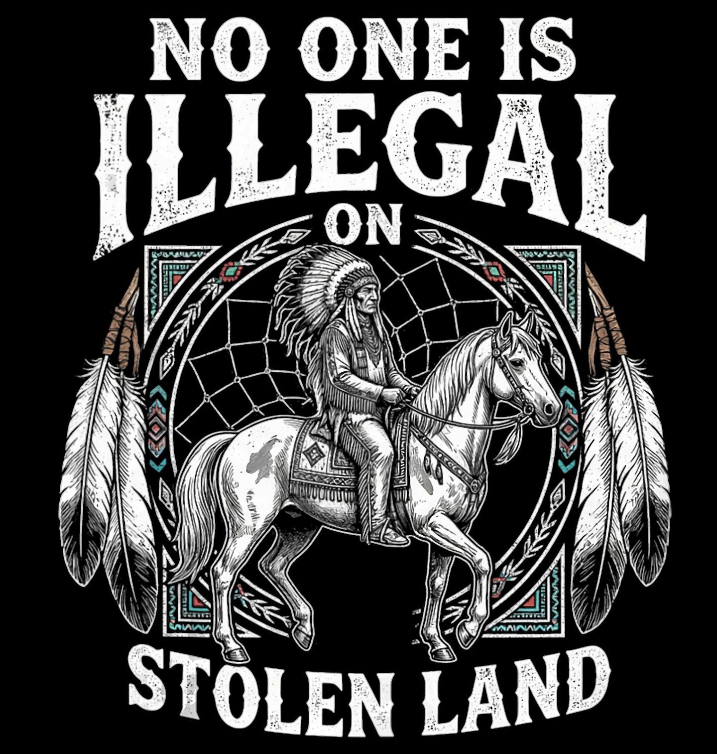 Dětské tričko Indián na Koni. Silný a symbolický design zobrazující indiána na koni s textem „NO ONE IS ILLEGAL ON STOLEN LAND“ (Nikdo není nelegální na ukradené půdě). Design vyjadřuje hluboké historické poselství, svobodu a respekt k původním obyvatelům. Ideální pro ty, kdo chtějí nosit výrazný a smysluplný motiv.