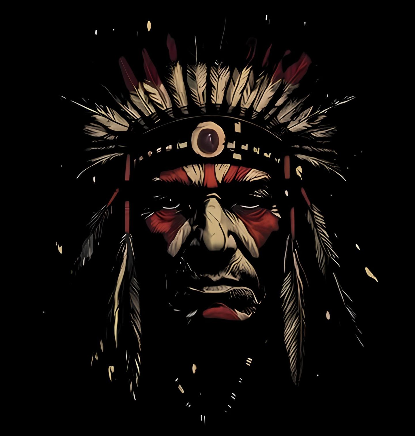 Pánské tričko Indiánský Náčelník. Silný portrét indiánského náčelníka s tradiční čelenkou a výrazným malováním obličeje. Tento motiv vyzařuje respekt, historii a kulturní hloubku. Detailní ilustrace zachycuje sílu a důstojnost původních obyvatel. Ideální volba pro milovníky historie a symboliky.