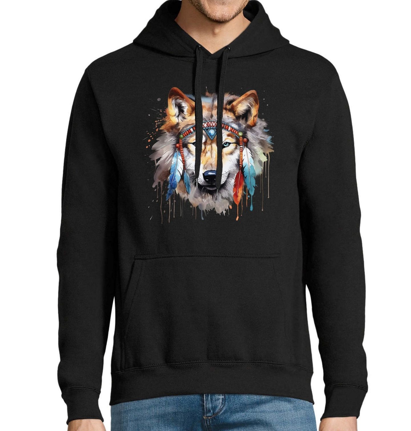 Pánská mikina Indiánský Vlk Vůdce smečky. Tento výrazný prvek symbolizuje propojení s duchovními tradicemi a sílu divoké přírody. Hlava indiánského vlka zdobená čelenkou z per a kamínků. Ideální volba pro ty, kdo se cítí inspirováni moudrostí a svobodou indiánské kultury.