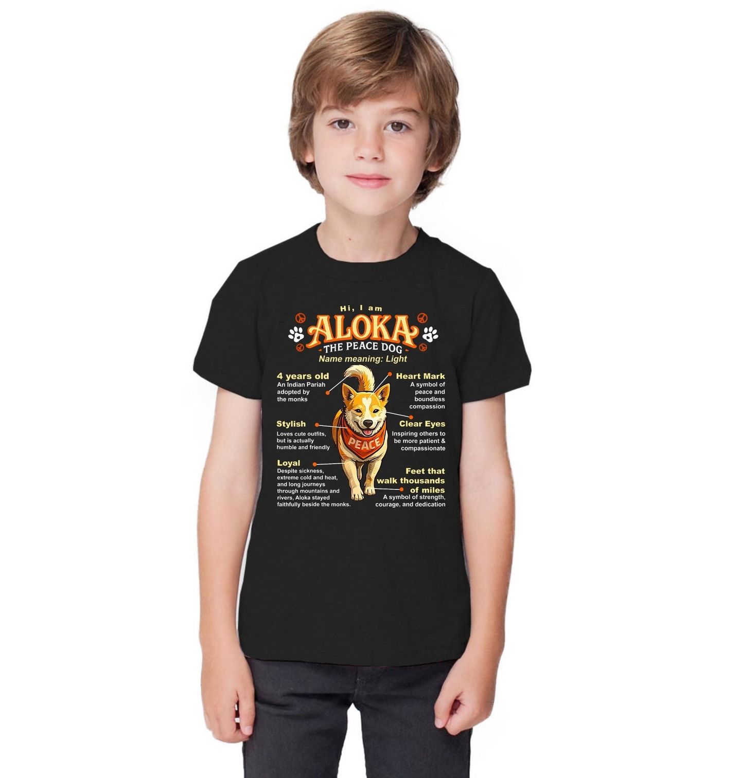 Dětské tričko Indický Pariah Pes Aloka. Tento motiv představuje psa plemene indický pariah jménem Aloka, který symbolizuje světlo, soucit a oddanost. Grafický design ukazuje příběh psa adoptovaného mnichy a zdůrazňuje jeho věrnost, sílu i přátelskou povahu. Tento pes motiv je inspirací pro všechny, kdo věří v dobro, mír a hluboké pouto mezi člověkem a psem.
