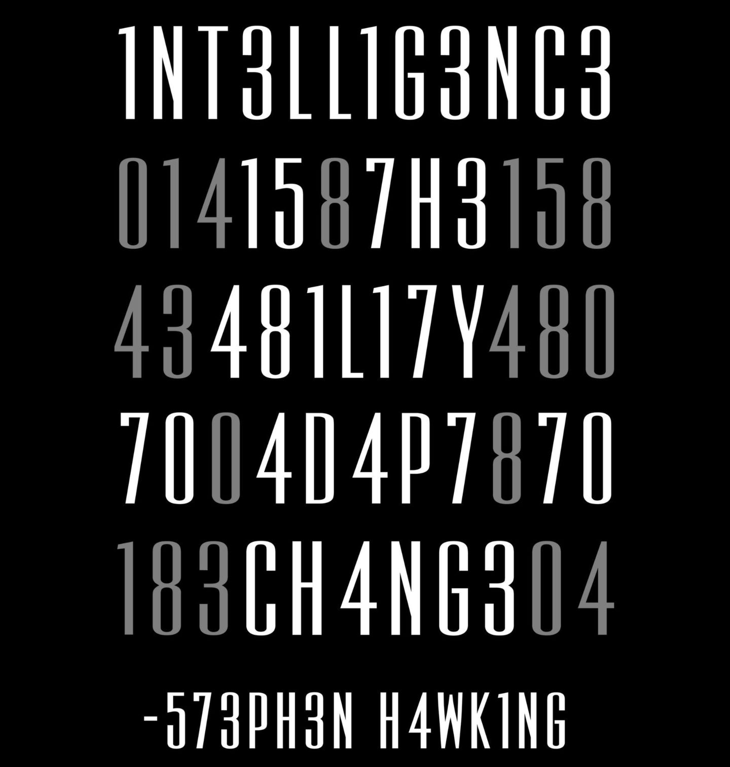 Dámské tričko Inteligence je schopnost přizpůsobit se změně Stephen Hawking. „Intelligence is the ability to adapt to change.“ – slavný citát Stephena Hawkinga, nyní ve stylovém šifrovaném designu („leetspeak“), který osloví každého, kdo se nebojí výzev a rád přemýšlí jinak. Tento design je ideální pro všechny, které fascinuje inteligence, věda, technologie, programování nebo inspirativní citáty.